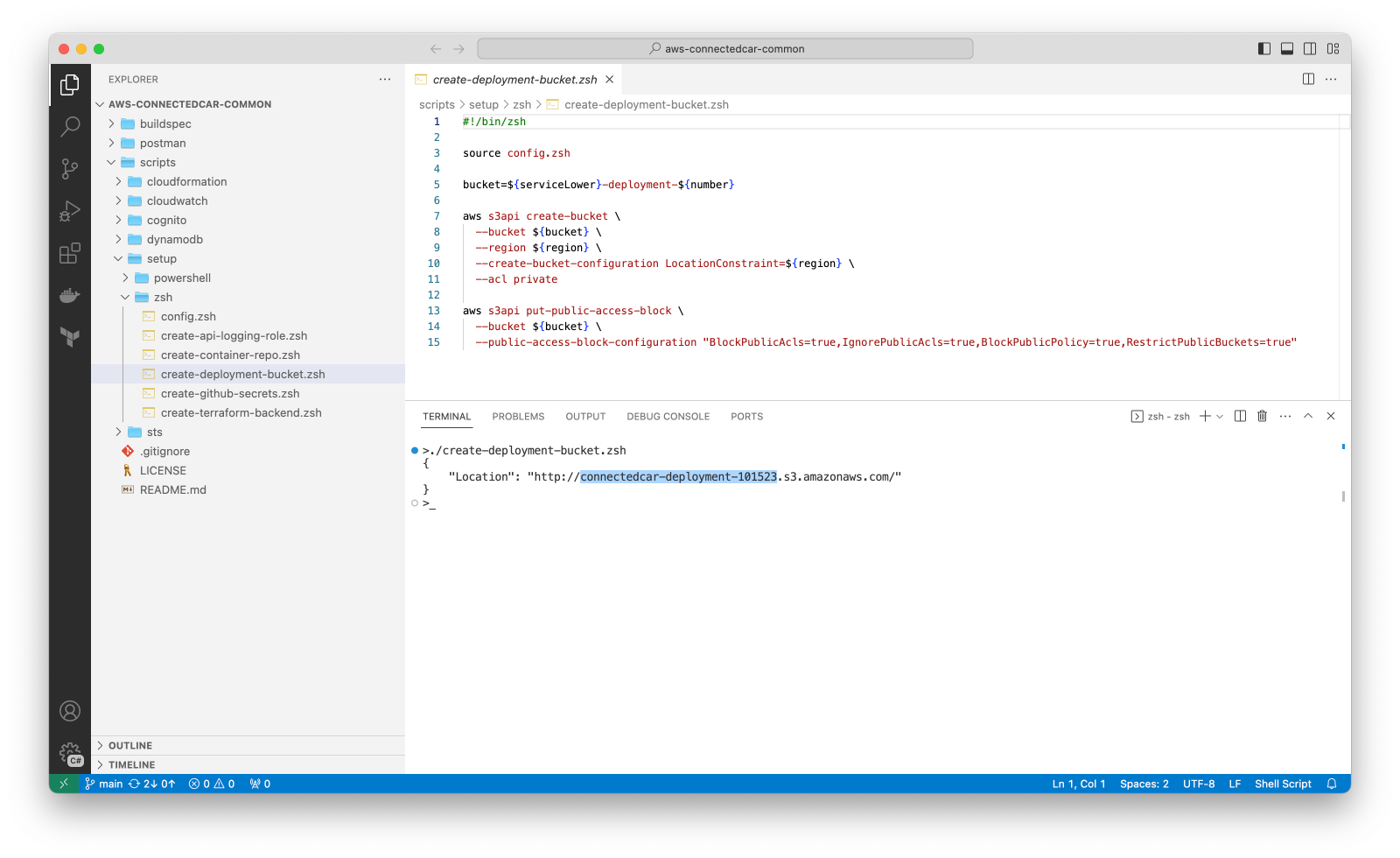 In VS Code, open the common repository and navigate to the /scripts/setup/zsh folder. There you should see the create-deployment-bucket.zsh script (note that there's an equivalent PowerShell script in an adjacent folder, if you are a Windows user). From the terminal, set execution privileges and run this script. Assuming your AWS CLI is working as expected, you should see an output like below, with a bucket name (highlighted) that you can copy and save for a following step:
