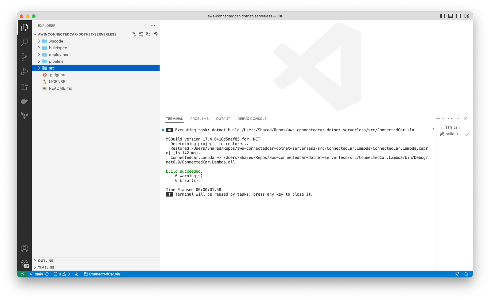 Once you've created the deployment bucket, you can move on to building and deploying the code. We'll start by doing a simple build in VS Code. This will validate your workstation's NuGet configuration and its access to the Github packages.