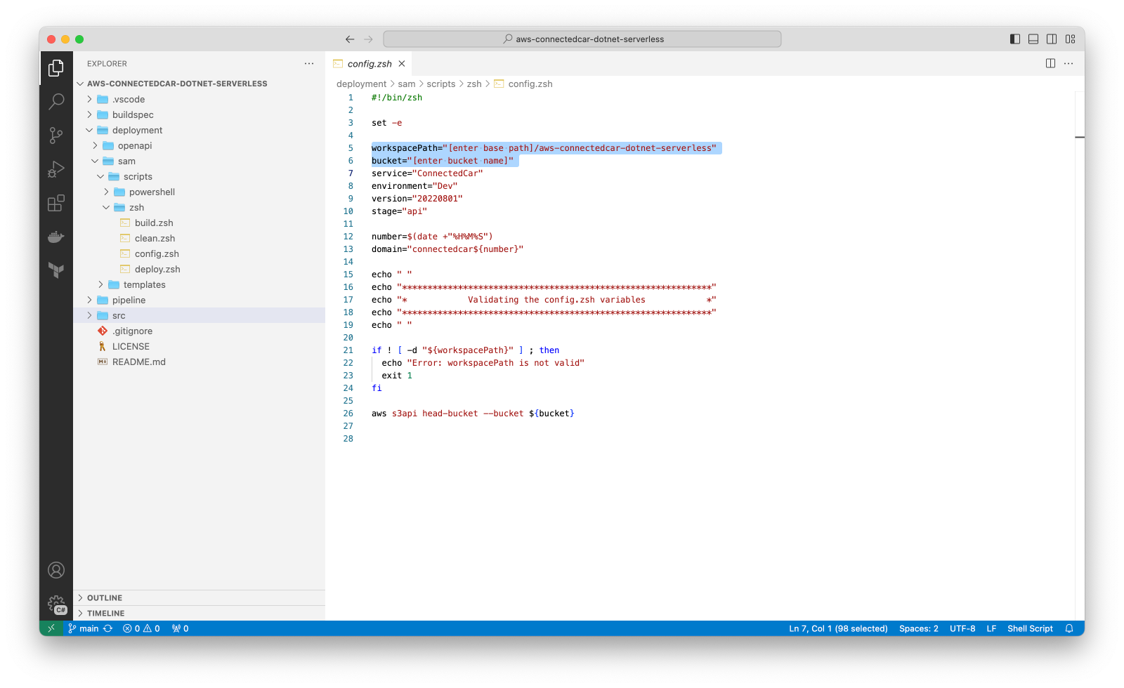 Now we're ready to run the command-line scripts that deploy the code to AWS. The first step is to open the config.zsh script in the /deployments/sam/scripts/zsh folder and update the "workspacePath" and "bucket" variable values, as highlighted below: