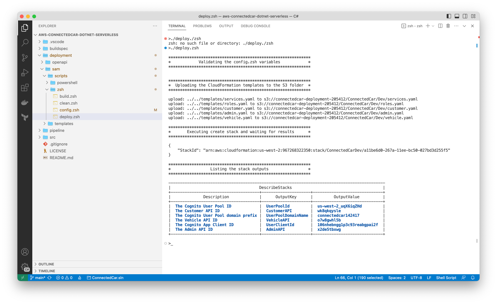 Lastly, run the deploy.zsh script. This will upload the CloudFormation templates for the solution to the deployment bucket, and then run the command to create a CloudFormation stack, which kicks off the deployment process in AWS. After a few minutes, if successful, you should see the CloudFormation stack outputs written to the console in the terminal, as shown below.