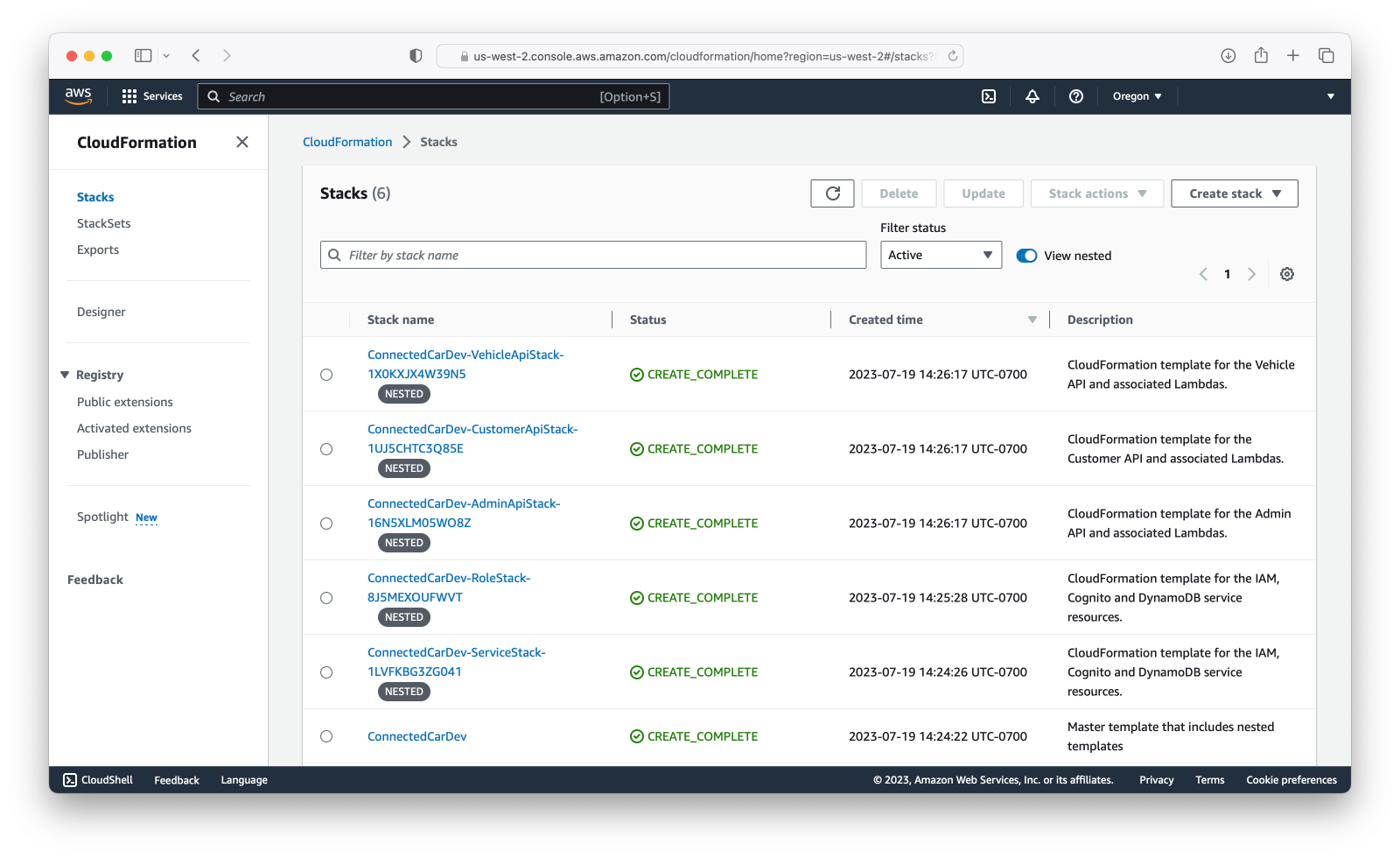 To view the results of the CloudFormation deployment in AWS, open the console and navigate to CloudFormation. Click on the "Stacks" menu on the left, and provided you are looking at the same region to which you deployed the code, you should see a list of stacks as shown below: