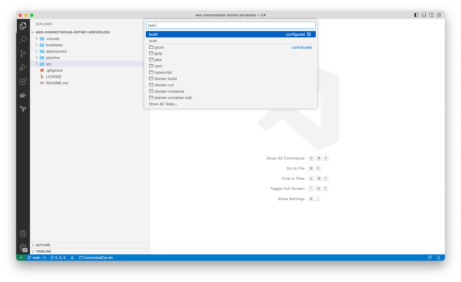 To perform this build, open the serverless repository in VS Code, press Cmd-P (or Ctrl-P for Windows) and type "task" plus a space. As shown below, this should display the build options in the tasks.json file, one of which is "build":