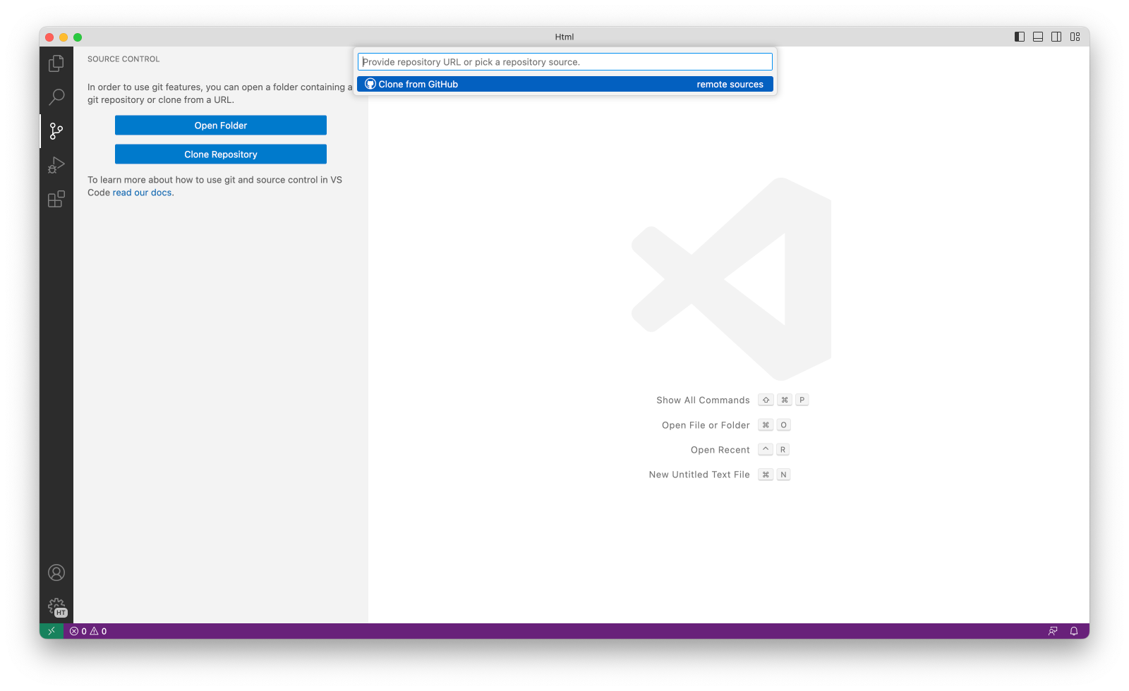 Next, open VS Code, select the source control icon on the left, and click the "Clone Repository" button. You'll then see the entry field and the "Clone from Github" option highlighted in the command palette, as shown below: