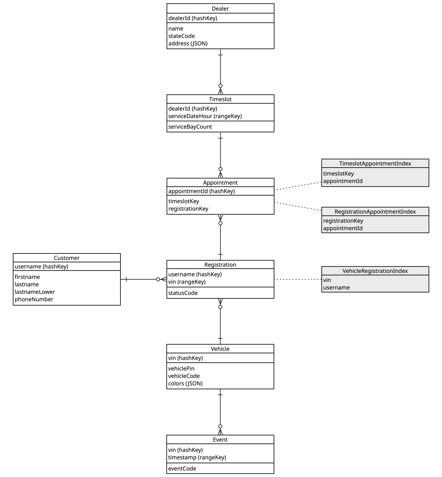 Note that to avoid hot partitions, the partition keys in the solution are either GUIDs or reasonably long string-formatted fields such as the customer username or vehicle vin. If you're not sure what "hot partitions" are, then see the data modeling section of the Learning AWS Serverless course.