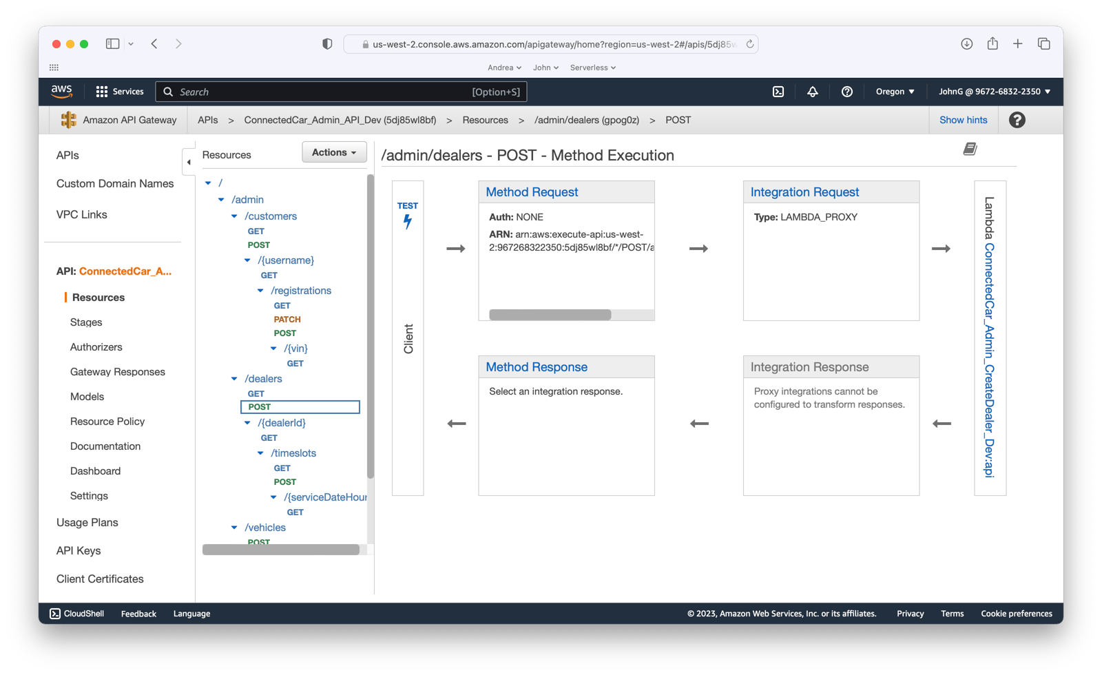 Switching back to the admin.yaml template, here’s the CreateDealer Lambda that’s associated with the HTTP POST event for the “/admin/dealers” resource path: