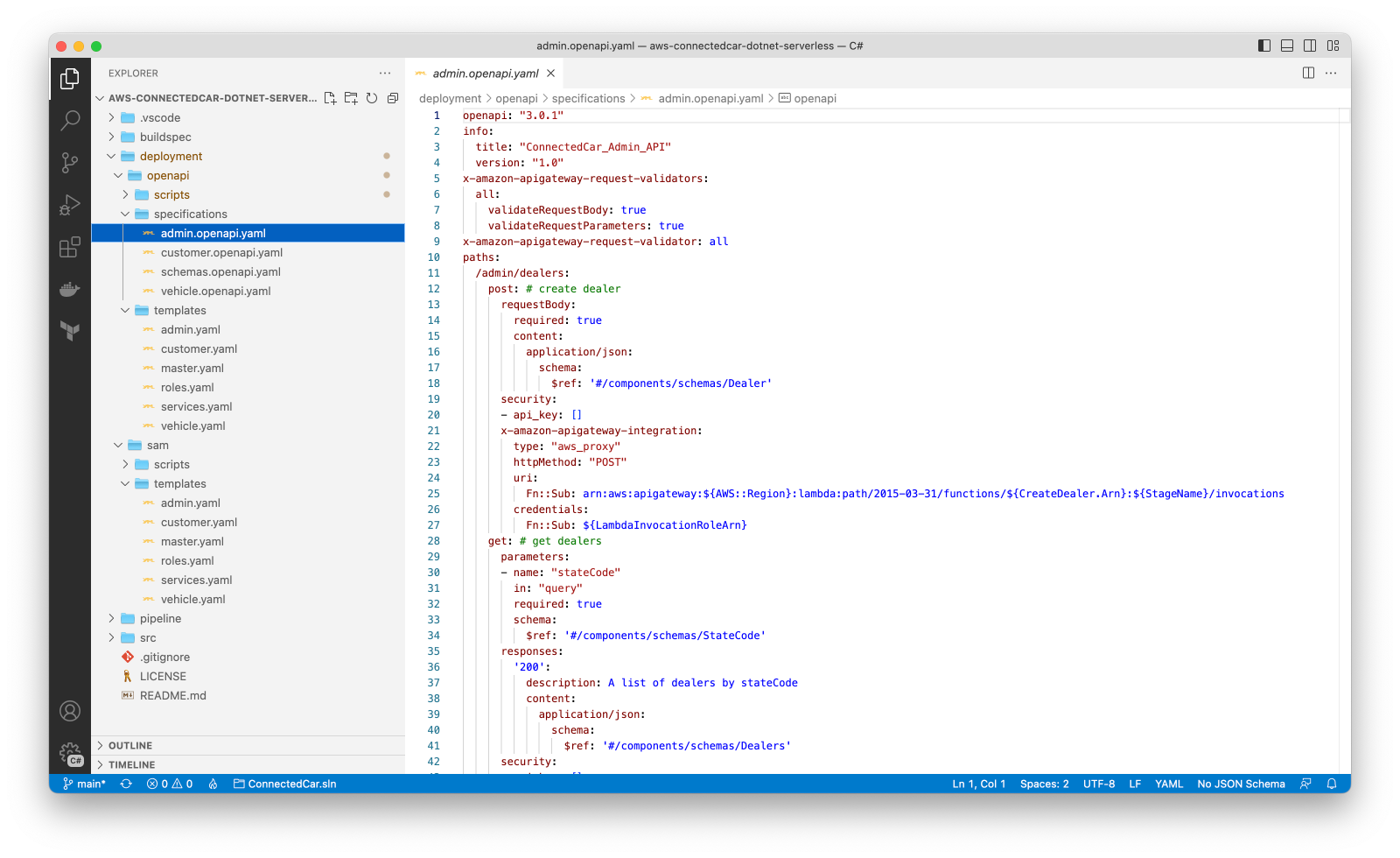 Looking at the VS Code “Explorer” panel on the left, you can see a set deployment files in the “sam” folder, including scripts and CloudFormation templates. Above the “sam” folder, there’s an equivalent “openapi” folder that contains a similar set of template files but also includes four OpenAPI files in the “specifications” folder. These four files correspond to the three APIs that need to be defined, plus one shared file that contains data schemas.