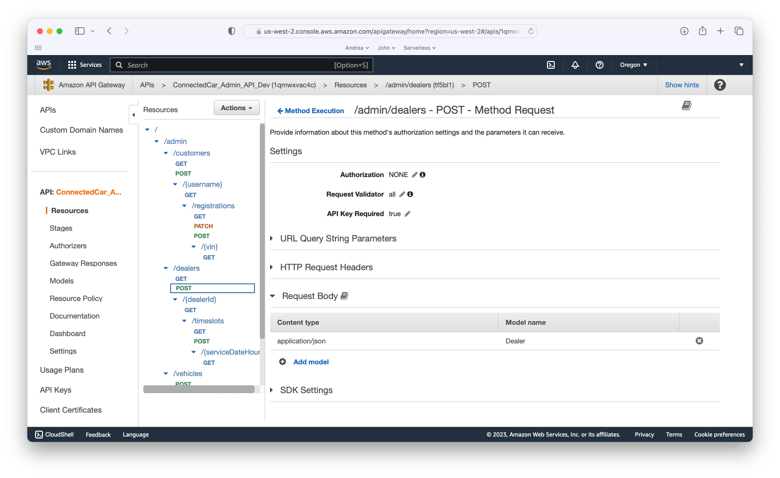 Let’s close out this lesson by going back to the AWS console to look at an OpenAPI deployment of the Admin API. First, here’s the “Method Request” page for the “/admin/dealers” POST method:
