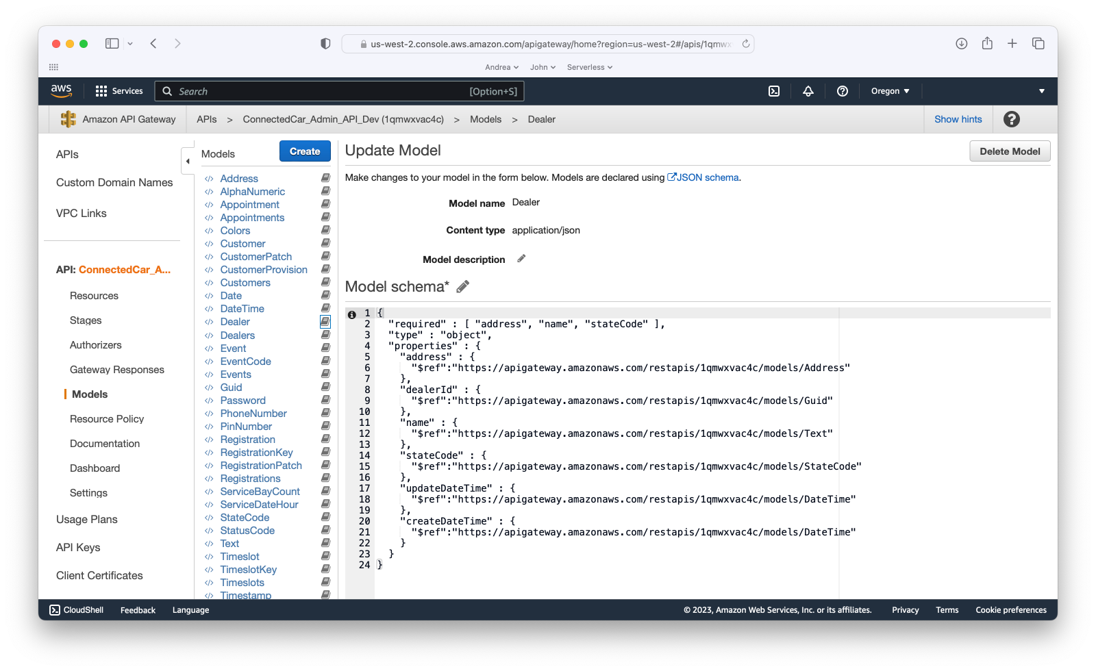 Further down on this page, under the “Request Body” heading, you can see a row with a “Dealer” item under the “Model Name” column. This is how API Gateway presents the associated data models for this API. All the field- and object-level data schemas that we defined in OpenAPI can be found on the “Models” page by following the link in the menu on the left.