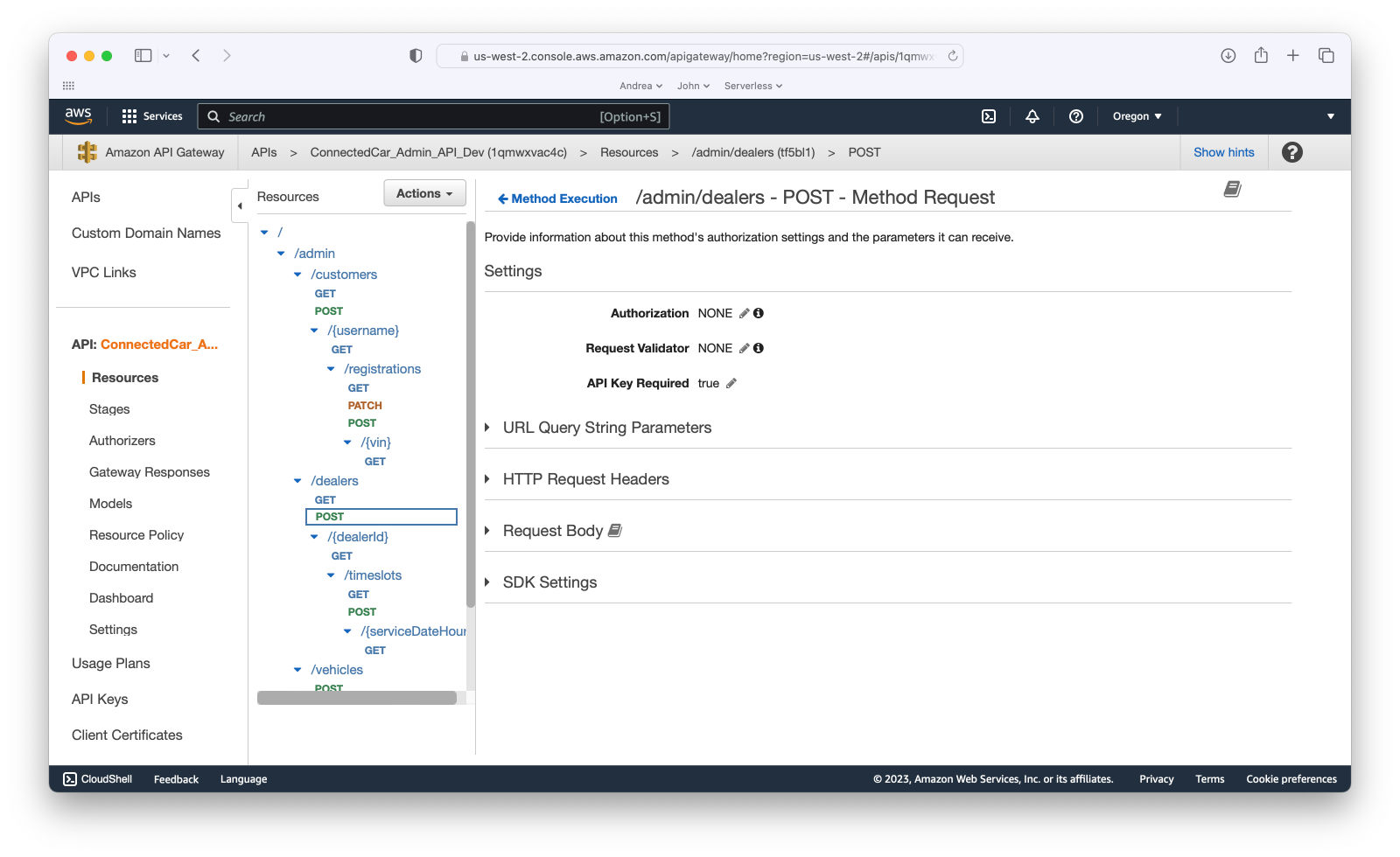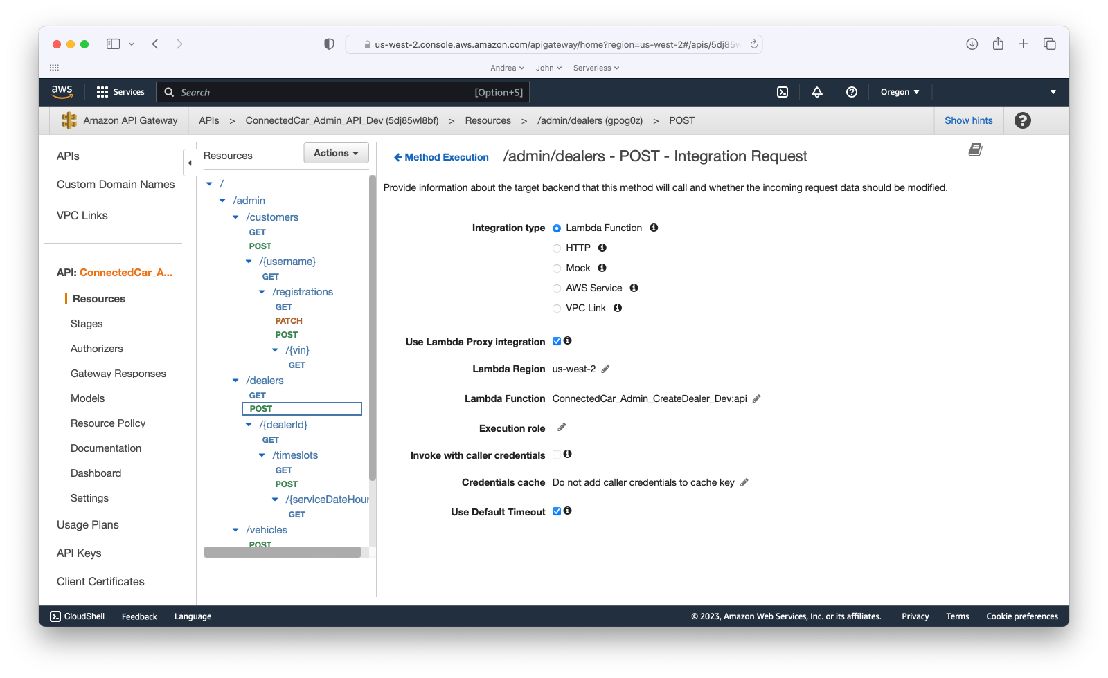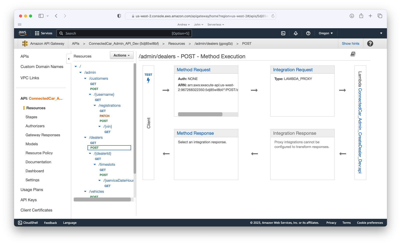 Switching back to the console, we can select the “/admin/dealers” path and the “POST” method for the CreateDealers Lambda that we saw defined above: