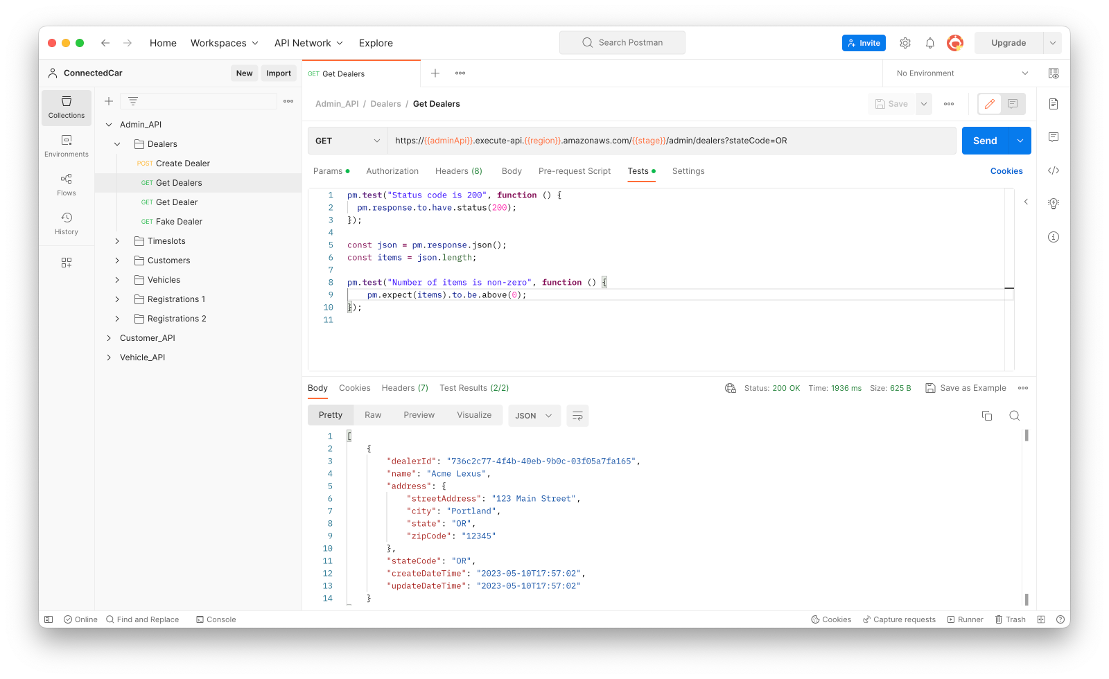 Before moving to the next step, it’s worth sending a request for one of the tests just to confirm the configuration. If you send a request for the “Get Dealers” test, you should see a “200 OK” response, like this: