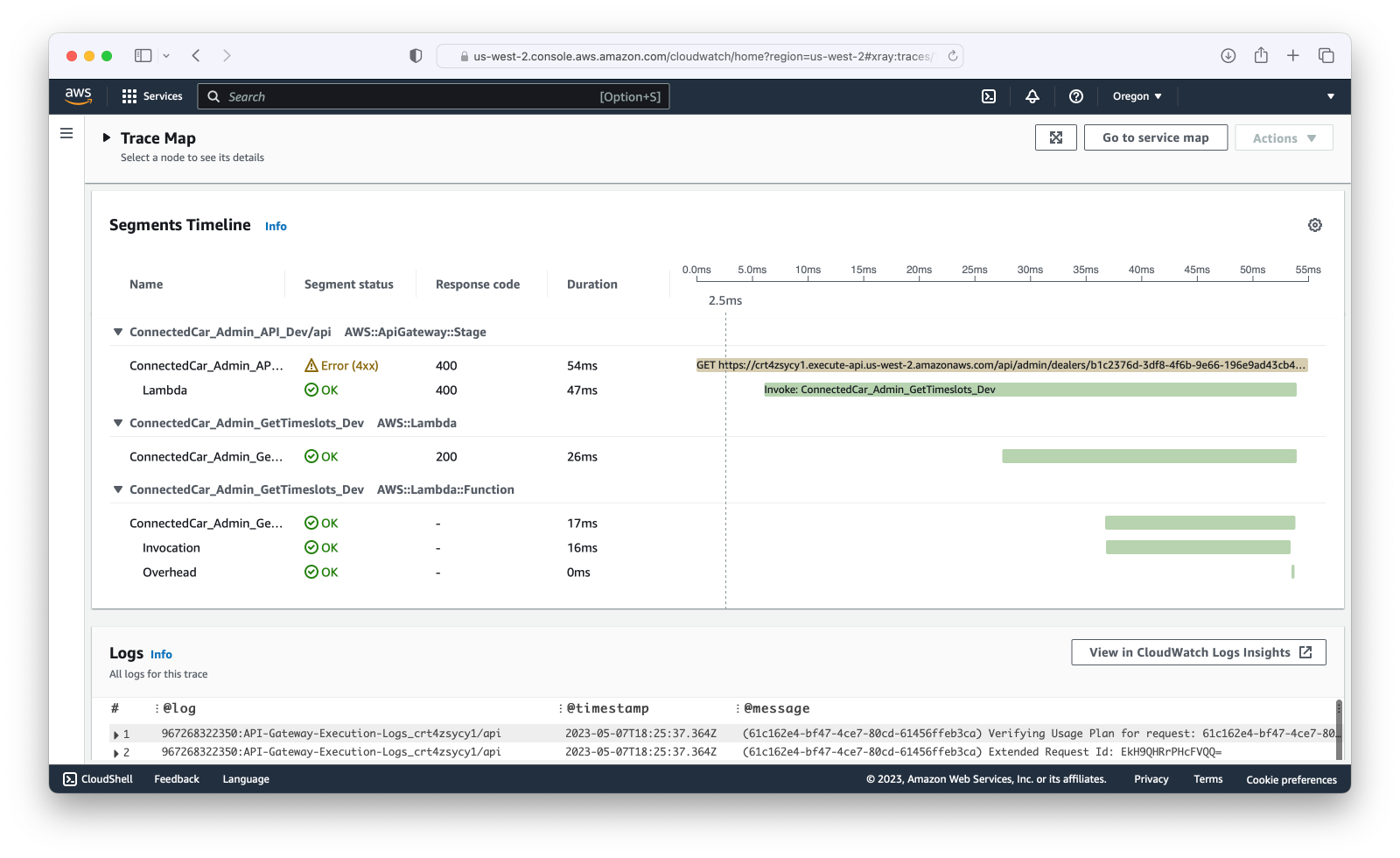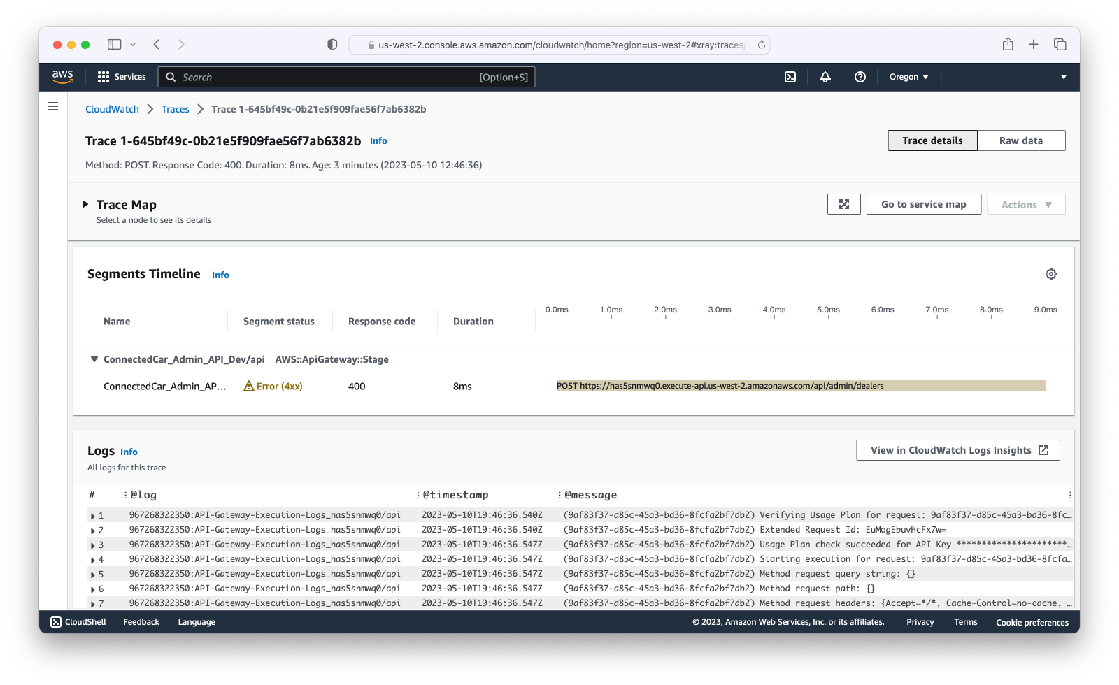 Compare the trace shown above with another trace that we captured in the CloudWatch labs for an invalid request: