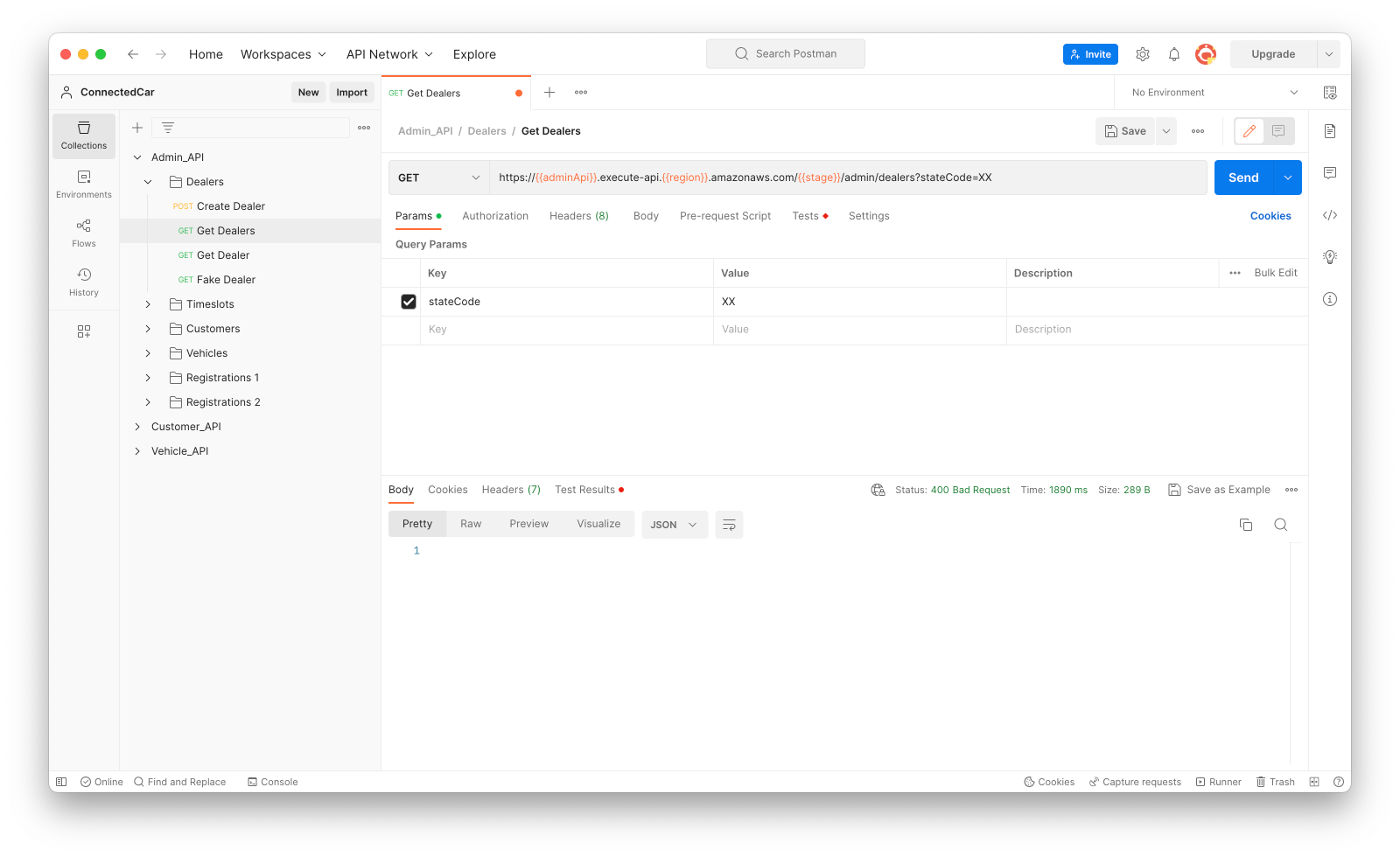 Step 4: Send a “Get Dealers” request with an invalid query parameter value