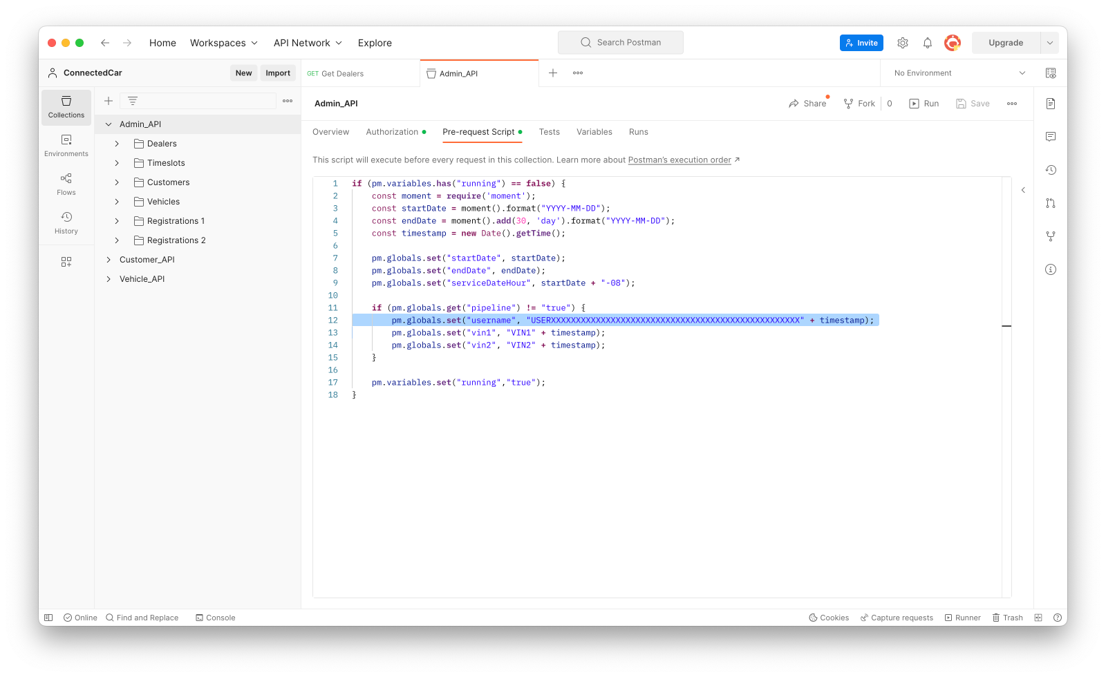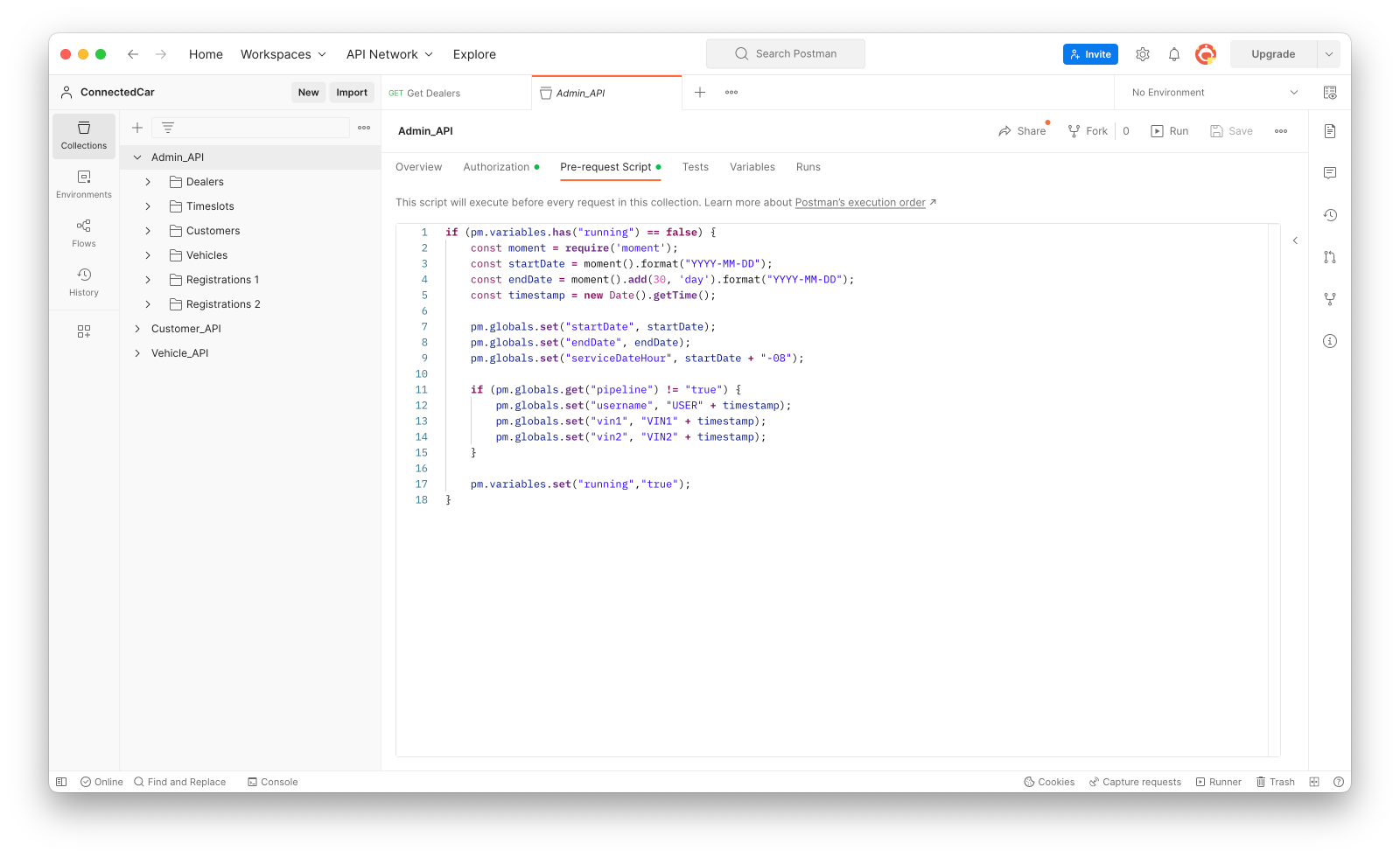 With this background information in mind, navigate to the “Admin_API” collection in Postman, and select the “Pre-request script” option at the top of the screen. You should see the code that sets some of the global variables before each test in the collection executes: