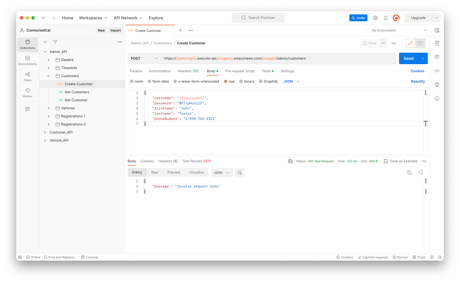 Apart from the length, adding these fifty characters does not violate the regex pattern in the AlphaNumeric field. Now open the “Admin_API” collection, then the “Customer” folder, and select the “Create Customer” test. After sending the request, you should once more get a “400 Bad Request” response: