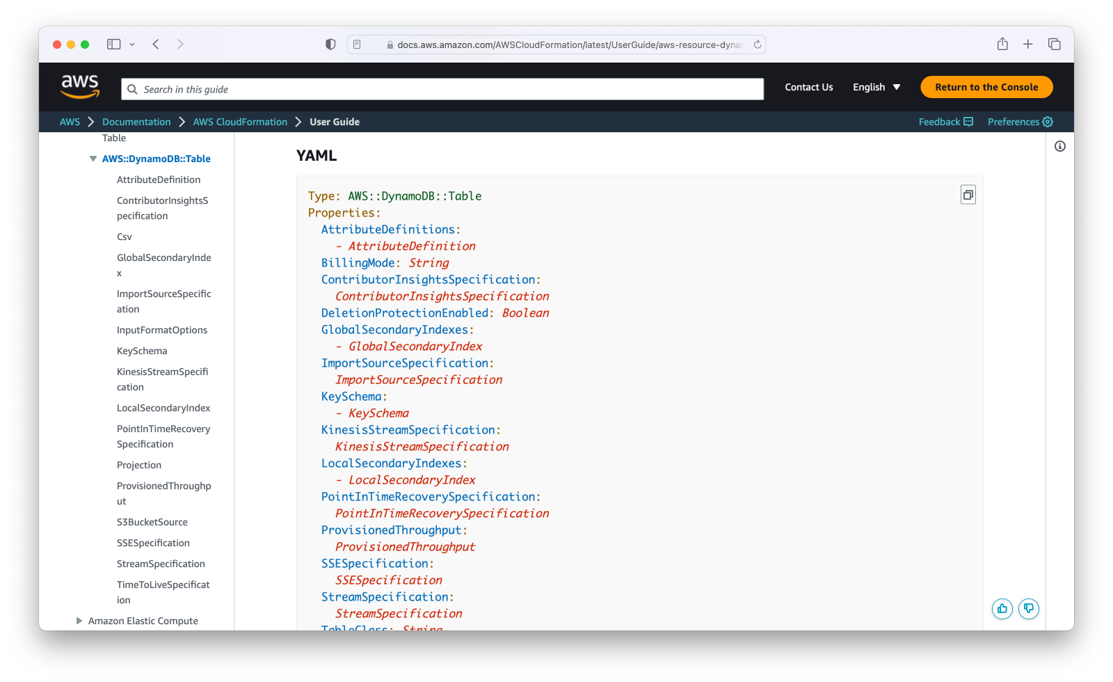 The first step when defining resources in CloudFormation is to search the AWS documentation for the target resource type. For example, searching for “cloudFormation dynamoDb table” will lead you to the documentation for the AWS::DynamoDB::Table resource type, shown below: