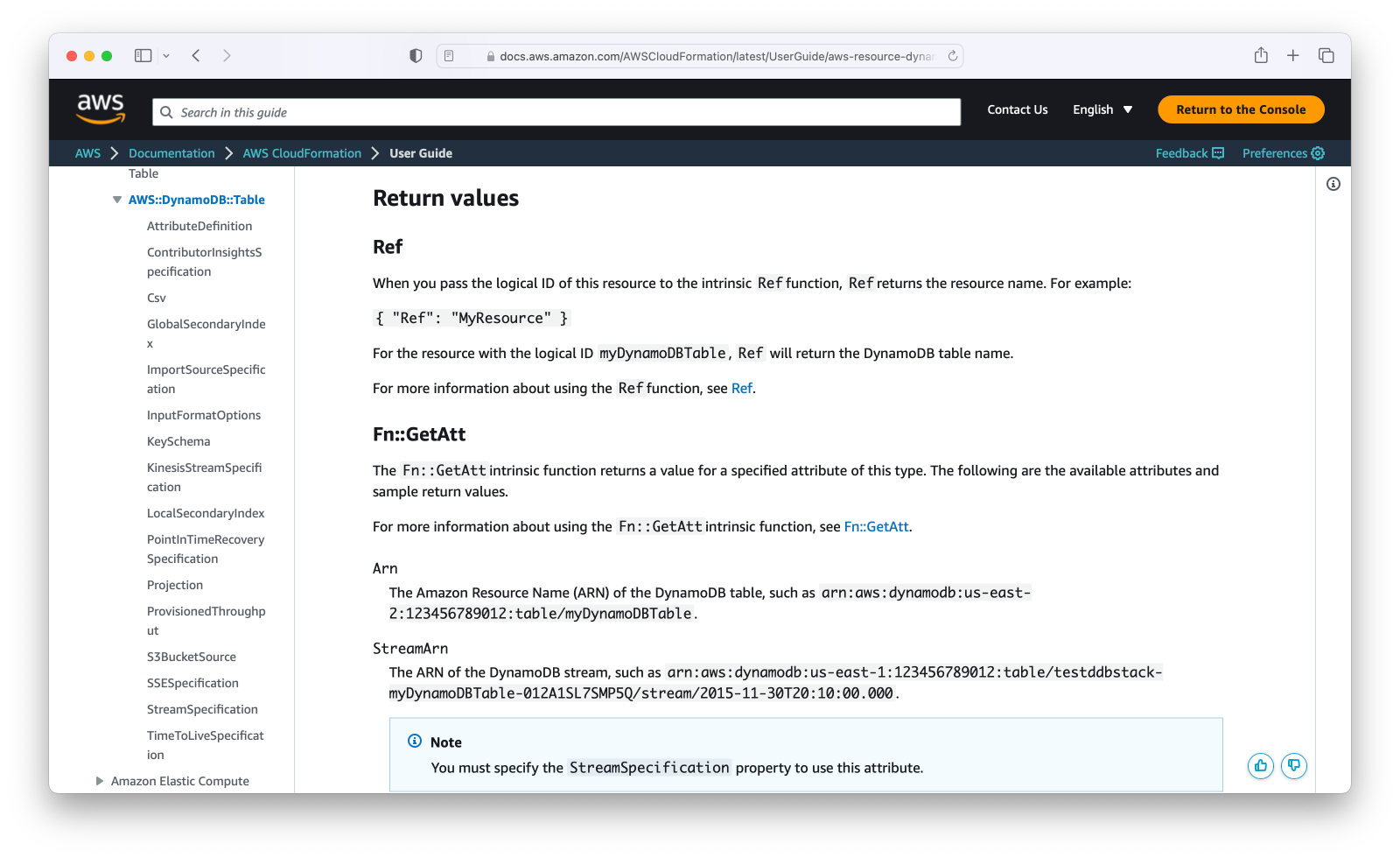 This documentation outlines the elements required for the resource in question, but there’s three additional ways that this documentation is important. First, it tells you which attribute or property is the default that’s returned by the !Ref function. Sometimes this is the user-define name, sometimes it’s a generated ID, and other times it’s the ARN. So you need to check the documentation to be sure.