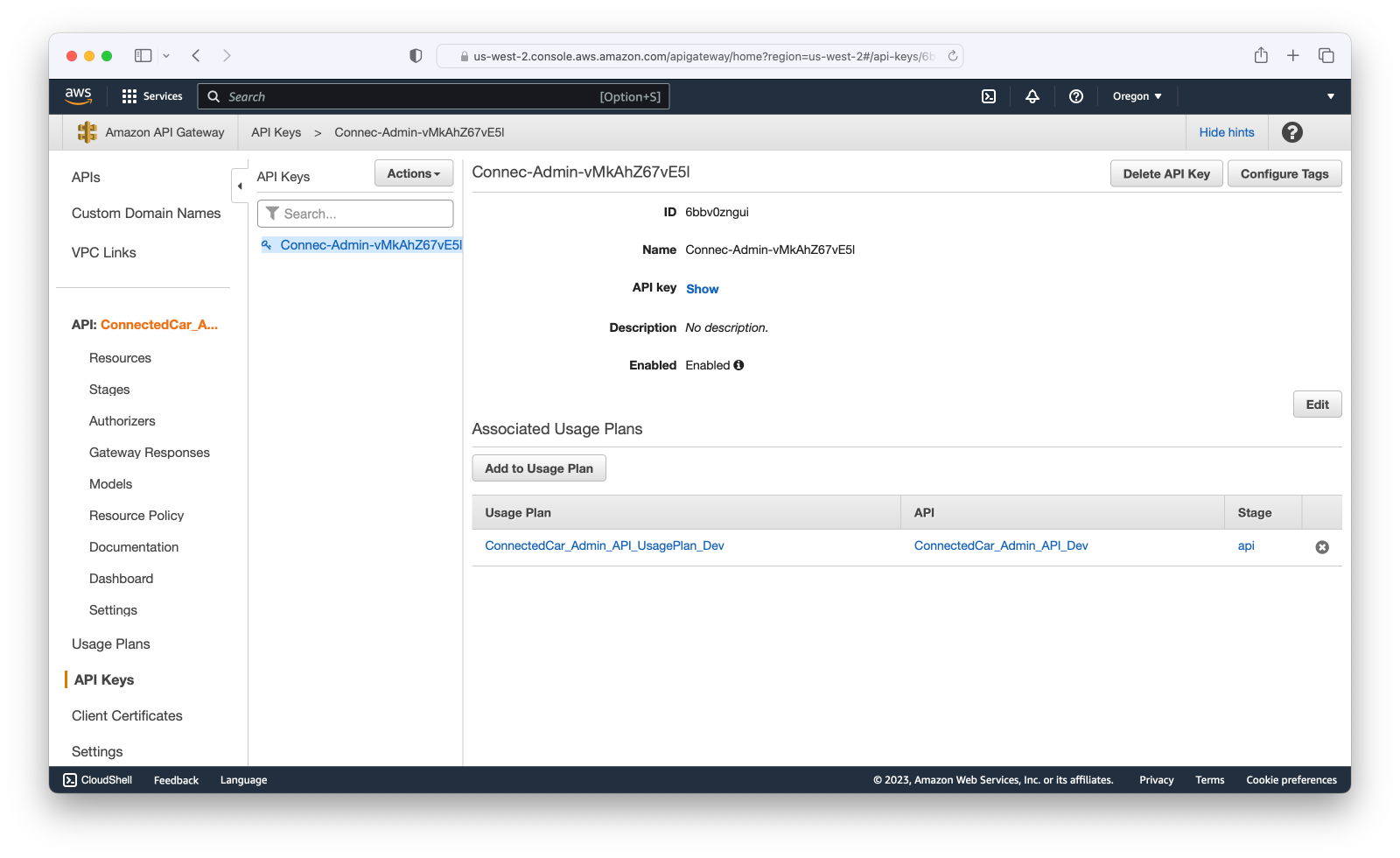 For now, you can get this value from the console. Start by navigating to the API Gateway service and selecting the Admin API. You’ll see the “Resources” option initially selected for the API. Select the “API Keys” menu option on the lower left, and then select the API key displayed in the next panel to the immediate right. At this point, you should see the API keys properties as shown below: