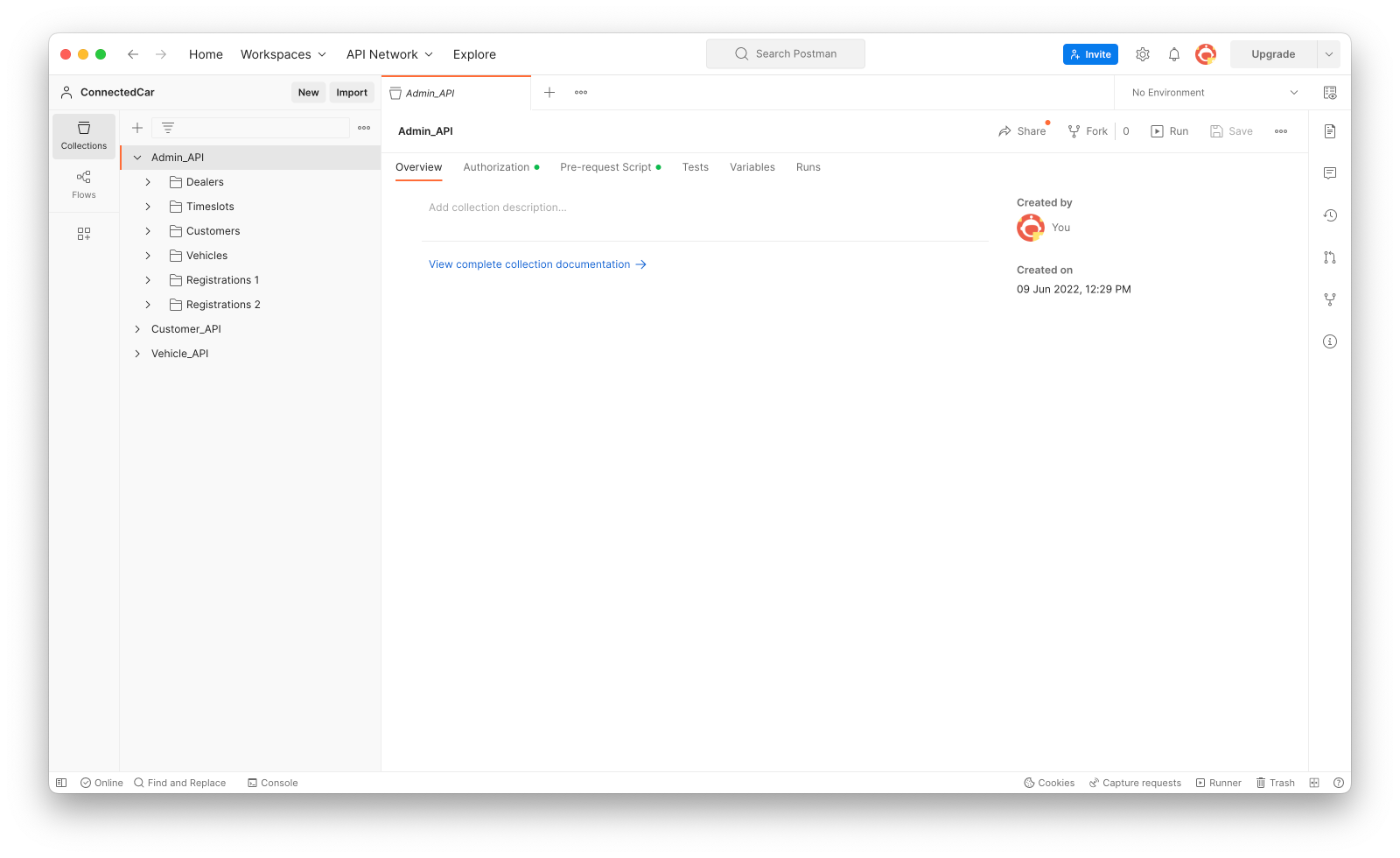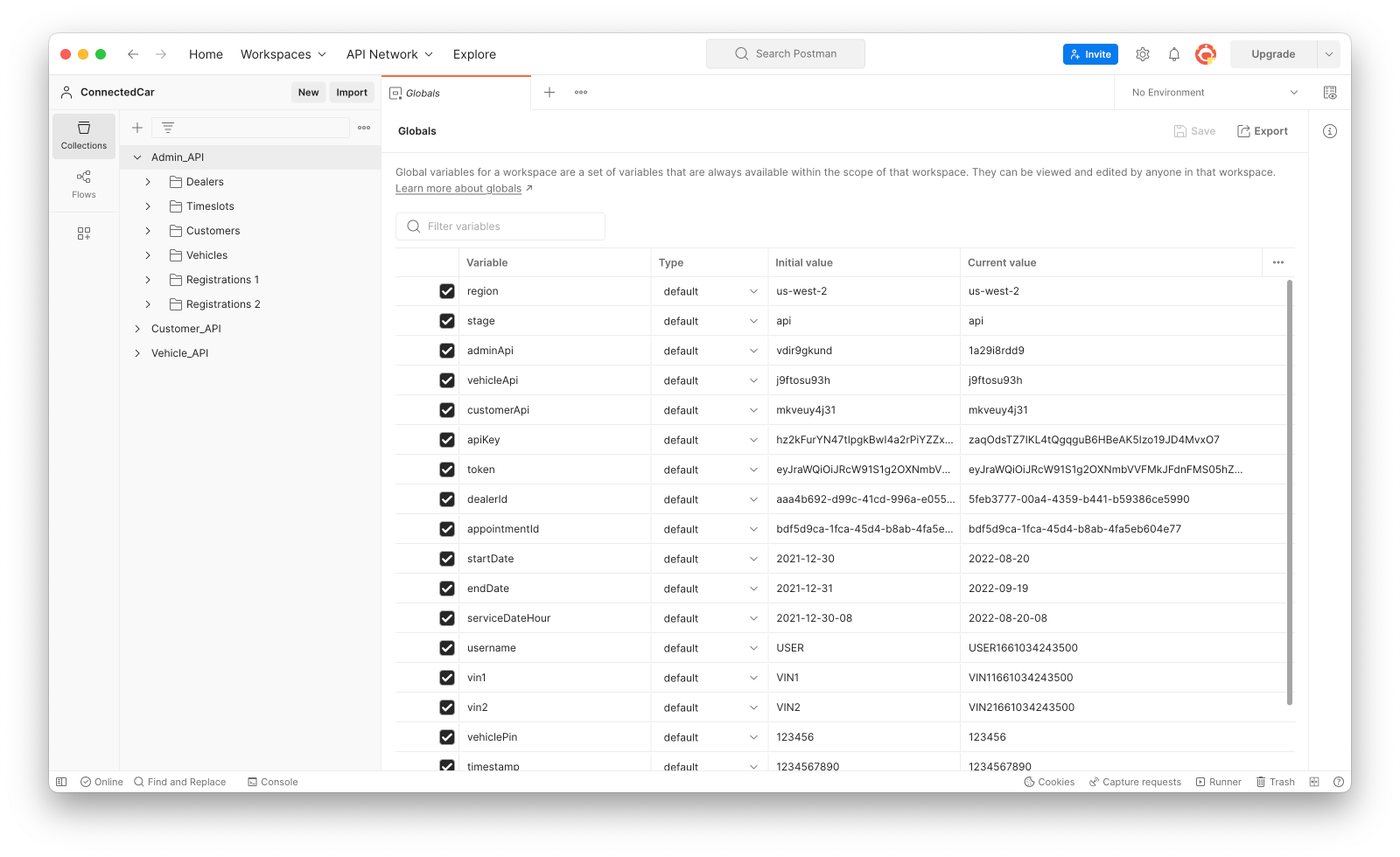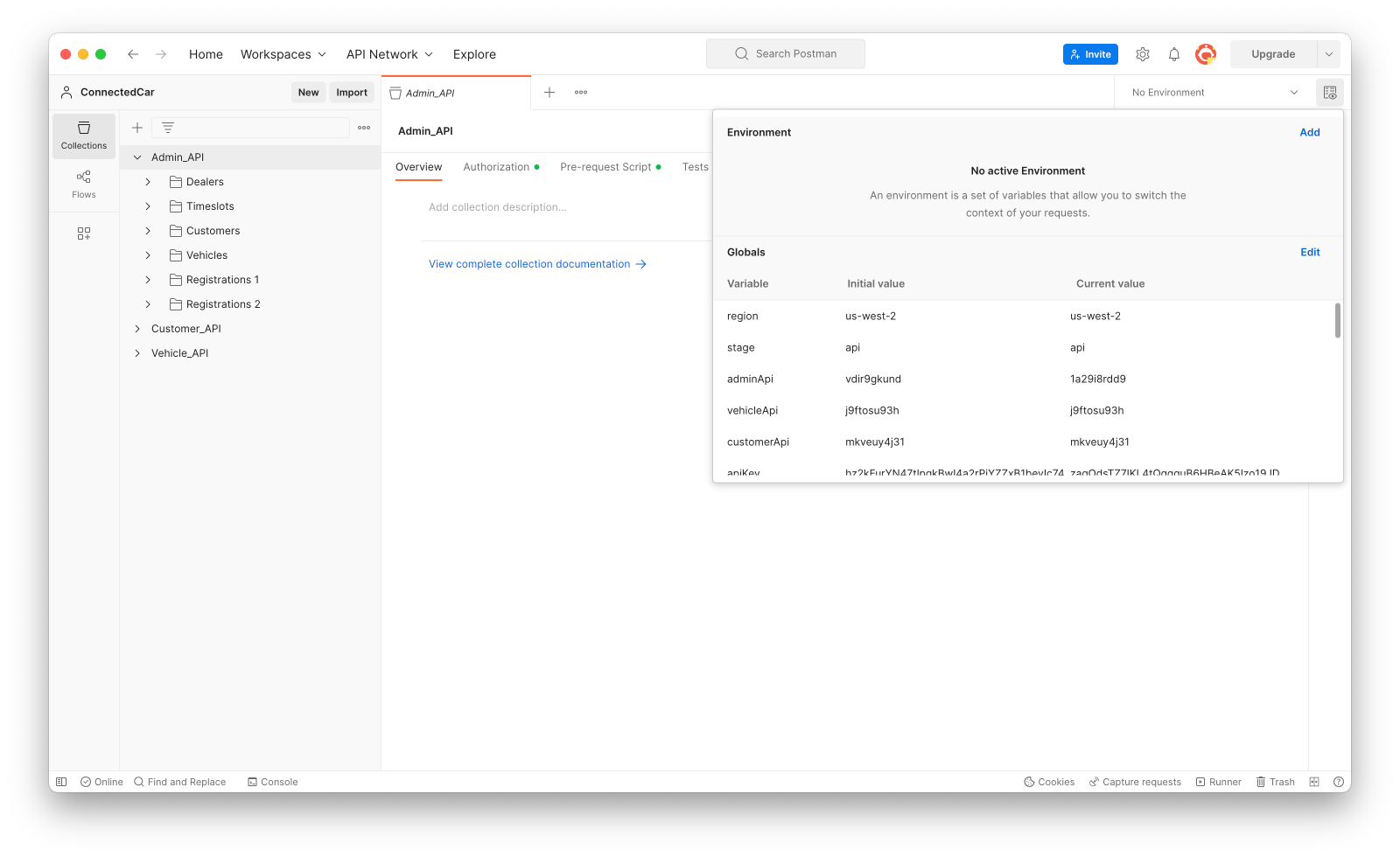 Now let’s take these two values we’ve obtained and set the corresponding global variables in Postman. Start by launching Postman and selecting the workspace into which you’ve imported the three test collections and the global variables. Then select the “Admin_API” collection. You should see something like this (bear in mind that the UX for Postman is constantly changing):