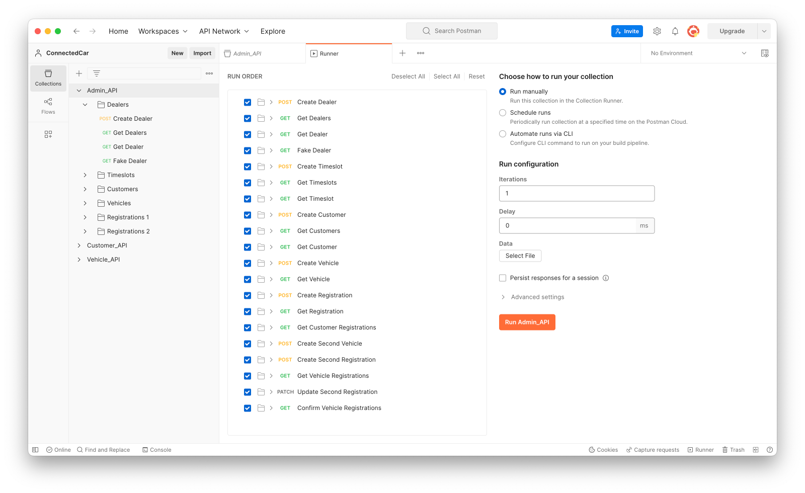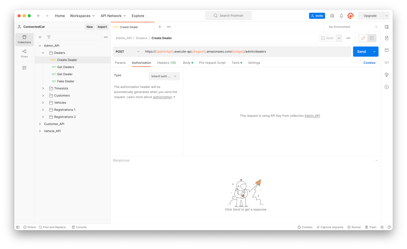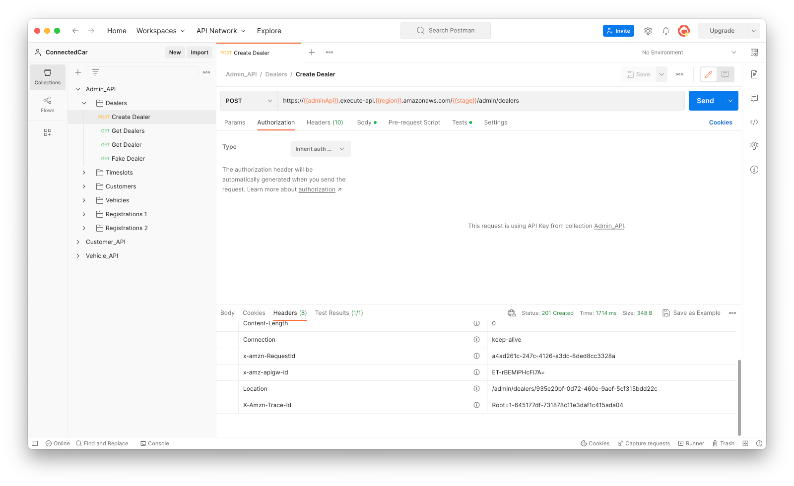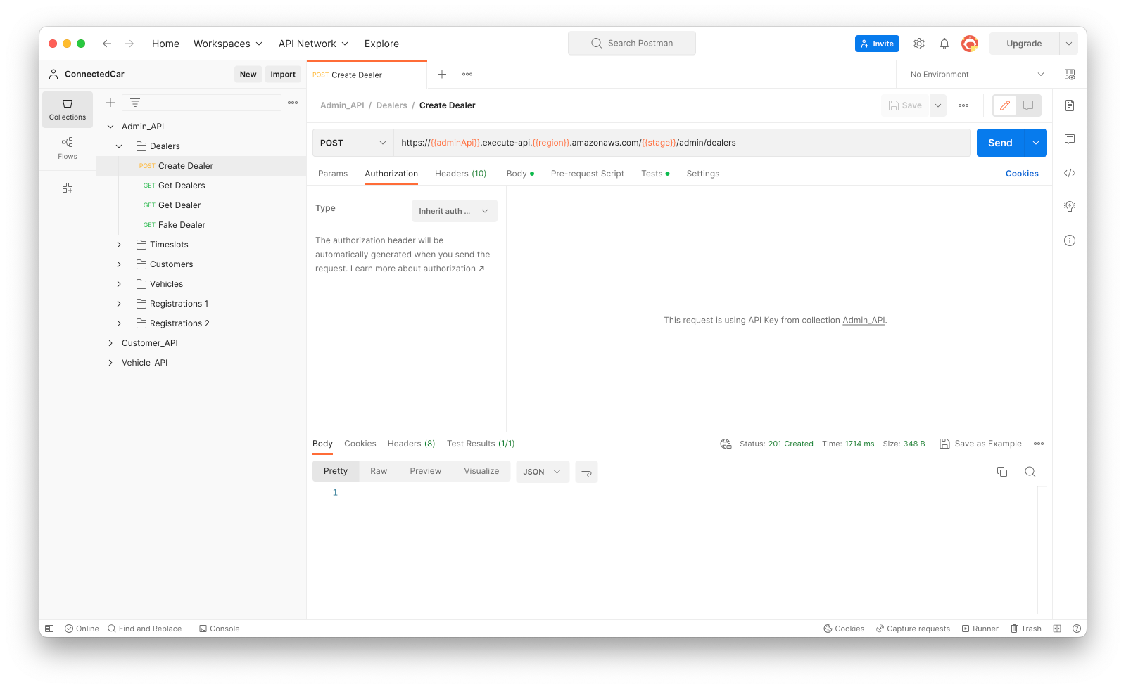 Now, let’s run the first test in the Admin_API collection. Expand the “Dealers” folder in the collection and select the “Create Dealer” test. You should see the tab for this test, as shown below: