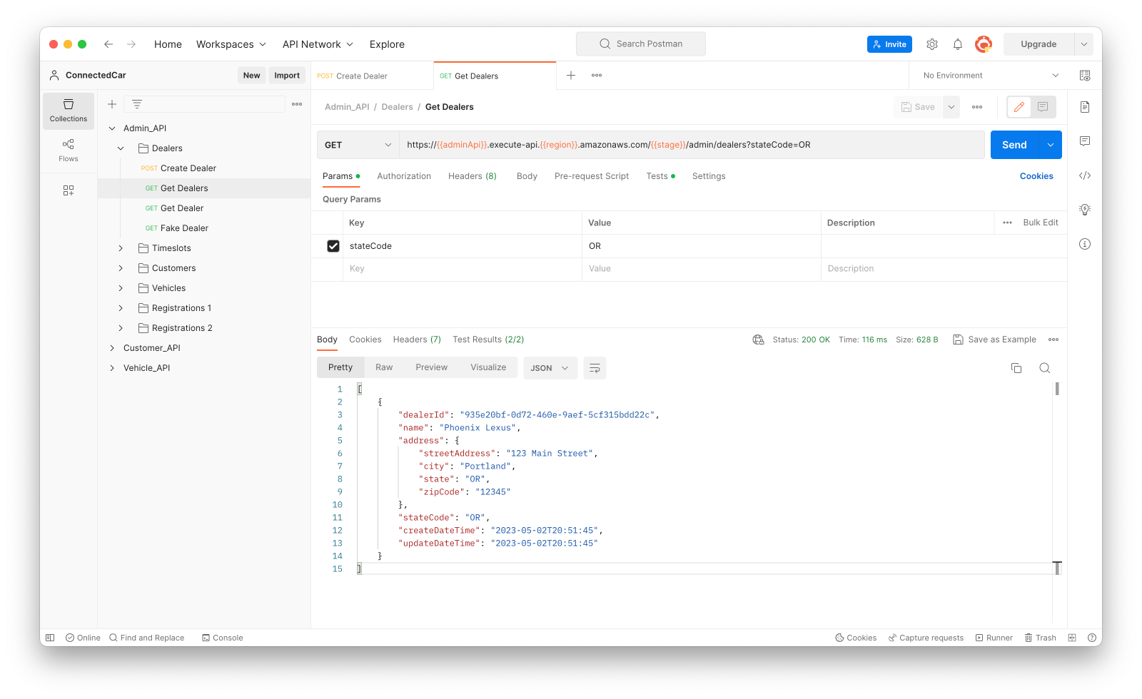 Next, run the Get Dealers test to confirm that the previous test successfully wrote data to the Dealer DynamoDB table. Here’s an example of the response you should see after sending a request for this test:
