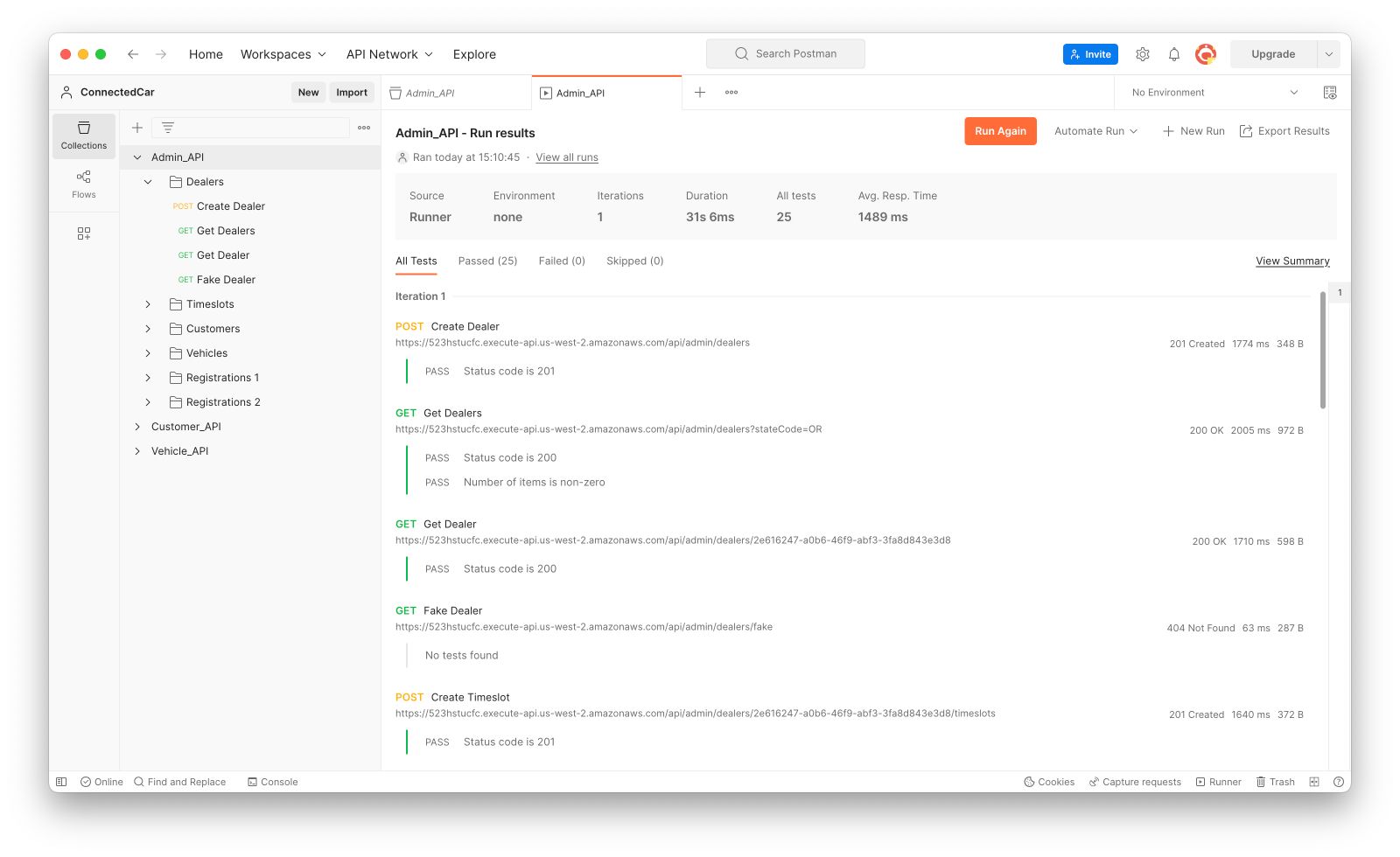 All the default settings in the panel on the right can be left as they are. Click on the orange “Run Admin_API” button on this panel. The tests will run in sequence, and once completed, the results should look like the screenshot shown below, with 25 tests passed and zero failed: