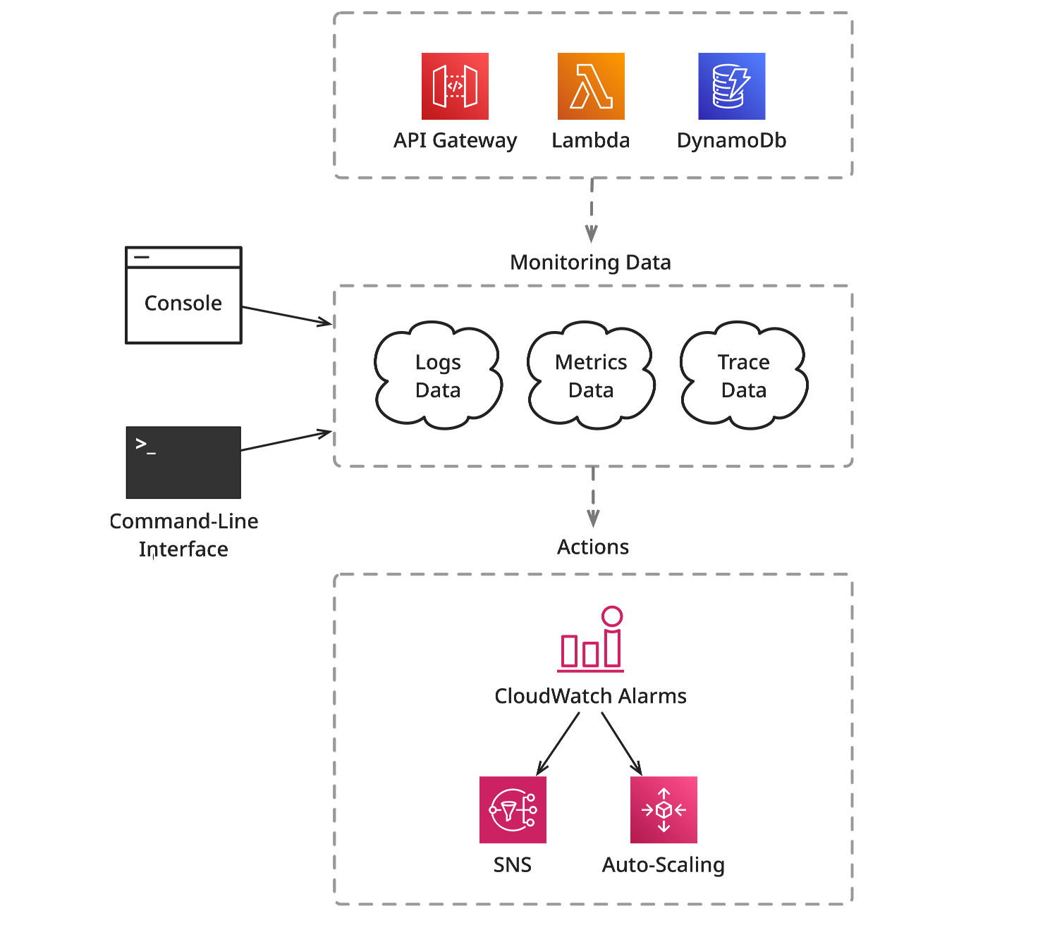 The concept diagram shown below illustrates the primacy of these core services. At the top, the components in your solution push data into CloudWatch. On the left, you can see console and command-line tools through which you can query and analyze this data. Then, as shown with the CloudWatch Alarms service on the right, additional services within CloudWatch build on this foundation. In this example, the capacity utilization notifications and service auto-scaling features are built on top of the Alarms feature which itself works by monitoring CloudWatch metrics.