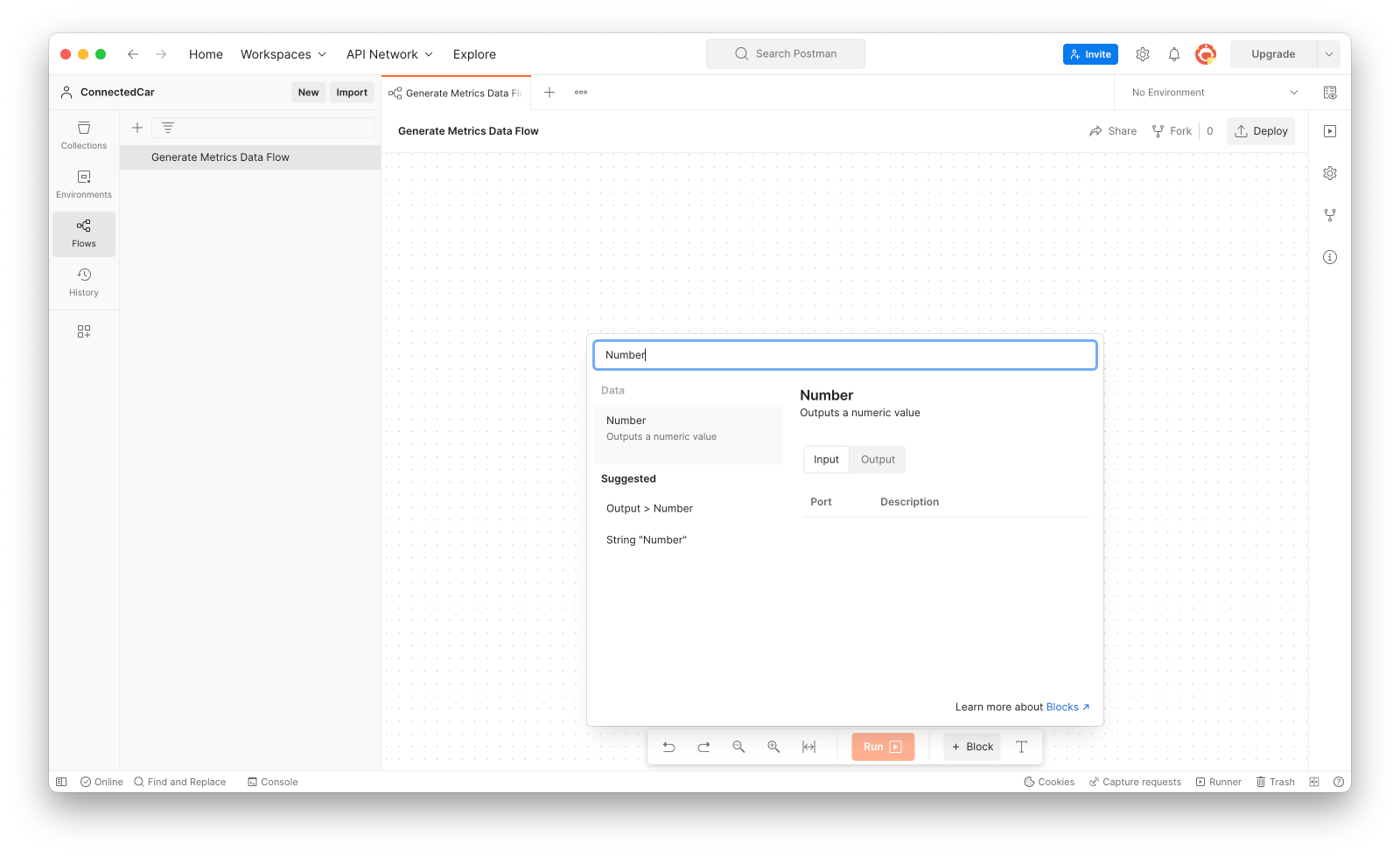 From Postman, start by clicking on the "Flows" menu on the left, and then clicking the “Create Flow” link in the panel on the left, or clicking the plus icon at the top left. This should result in a new tab appearing in Postman for the new flow. Give this flow a suitable name, such as “Generate Metrics Data Flow” as shown below: