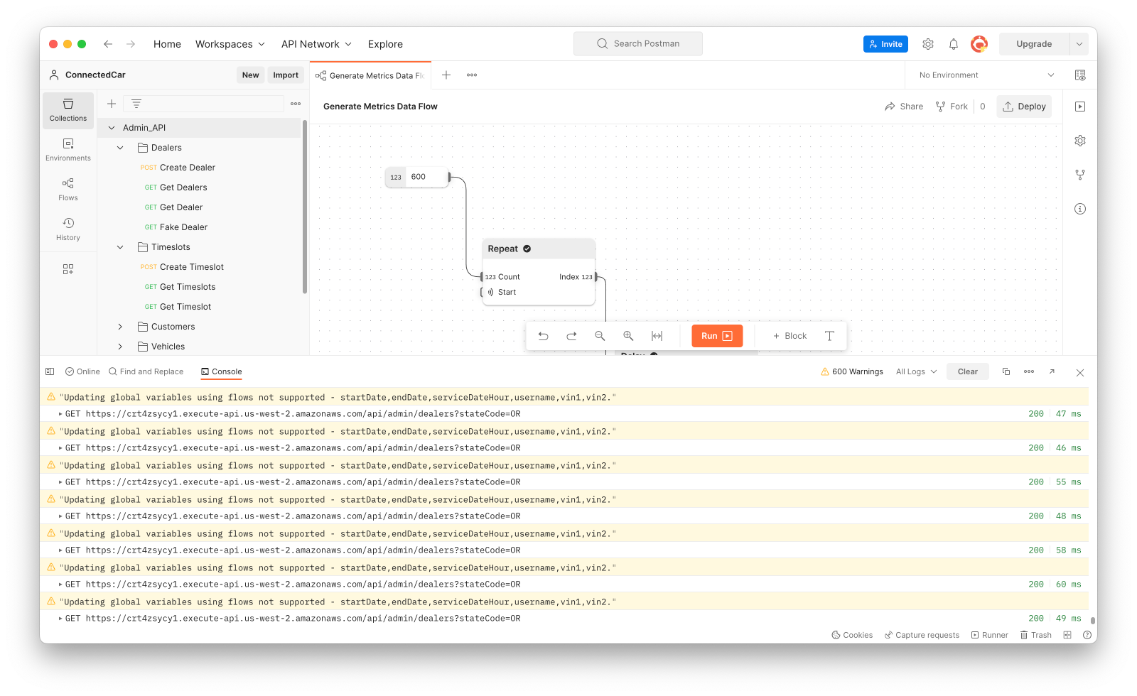 Once this flow is built, you can click on the orange “Run” button on the bottom, and it should then execute for the next ten minutes. Once complete, you can open the console in Postman, and you should see 600 successful requests interleaved with 600 warnings about setting global variables from within a flow (which in this case, you can safely ignore):