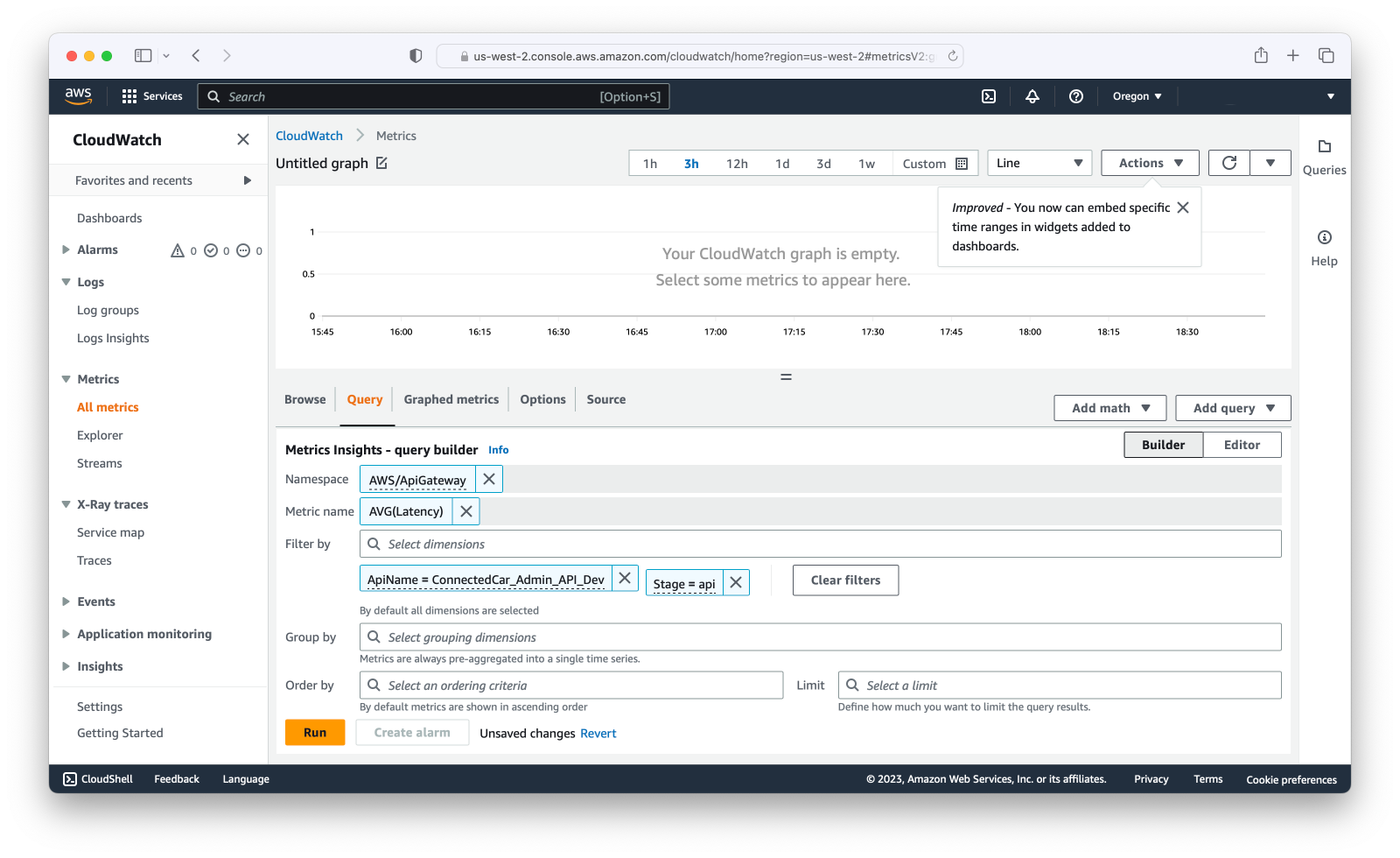 Metrics queries like this can have additional filters applied. In this case, the results for API Gateway can be filtered by one or more dimensions, such as API name, method, or resource path.