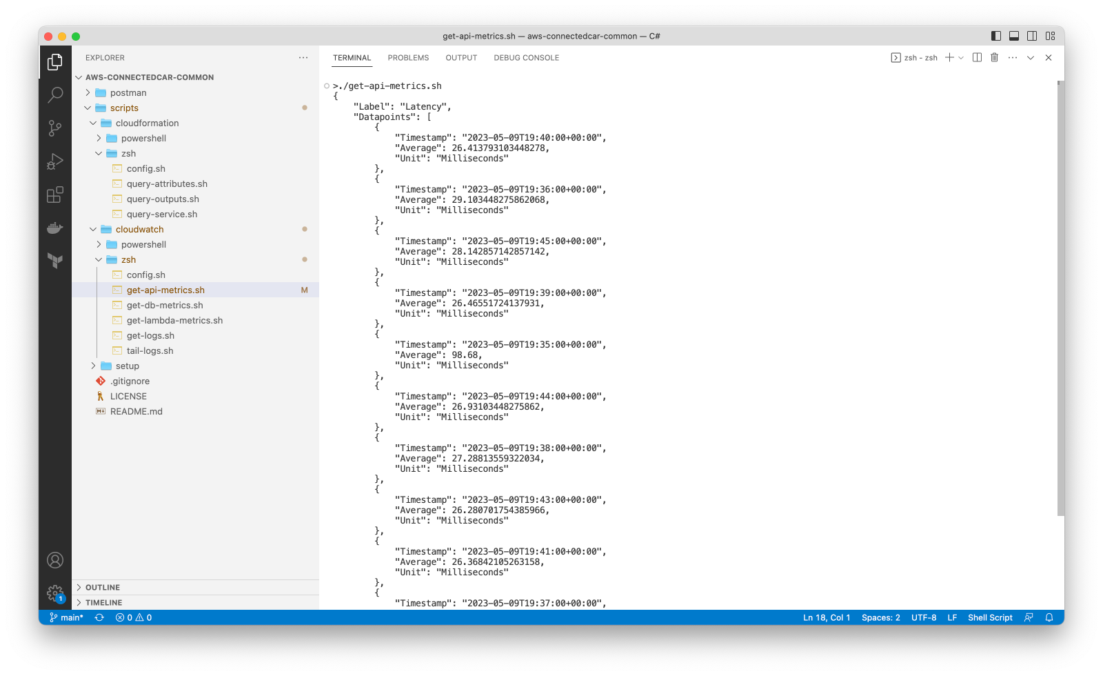 Take a look at the get-api-metrics.zsh script that’s in the /scripts/cloudwatch/zsh folder. This script uses the CloudWatch “get-metric-statistics” command, and the arguments used exactly mirror those used for the query we just ran in the console: