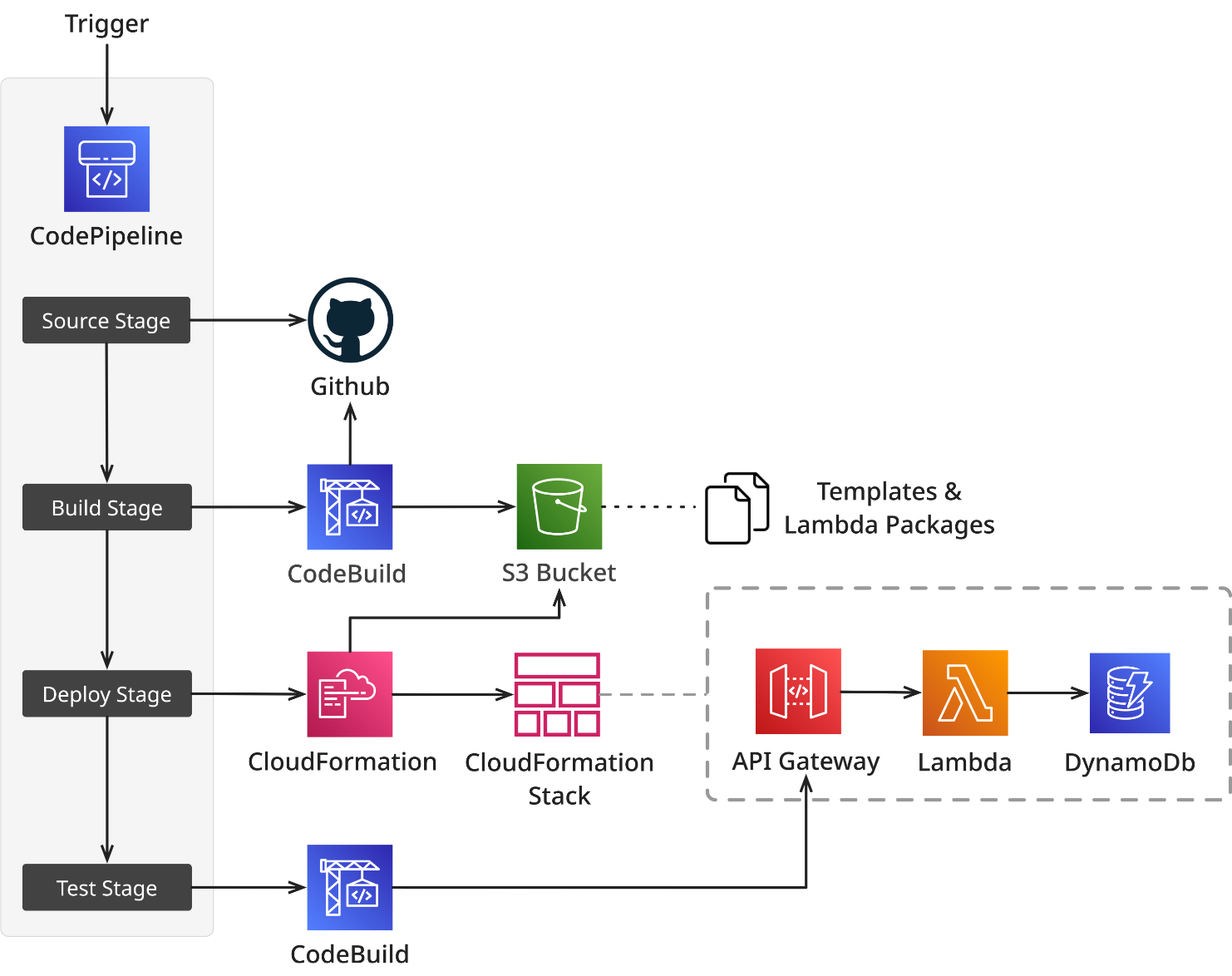 On the left side of the diagram, you can see the sequence of steps for the parent CodePipeline service. At the top, something has to trigger the pipeline, which in our case is done manually in the console. It’s possible to define automated triggers that run the pipeline when, for example, code is checked into the repository, or a branch is merged. Within the pipeline, shown on the left in the shaded box, you have a series of stages, each of which includes one or more actions. Each of these stages define source and destination paths to which the actions read and write as they execute. There is an S3 bucket specified for the pipeline that hosts these paths.