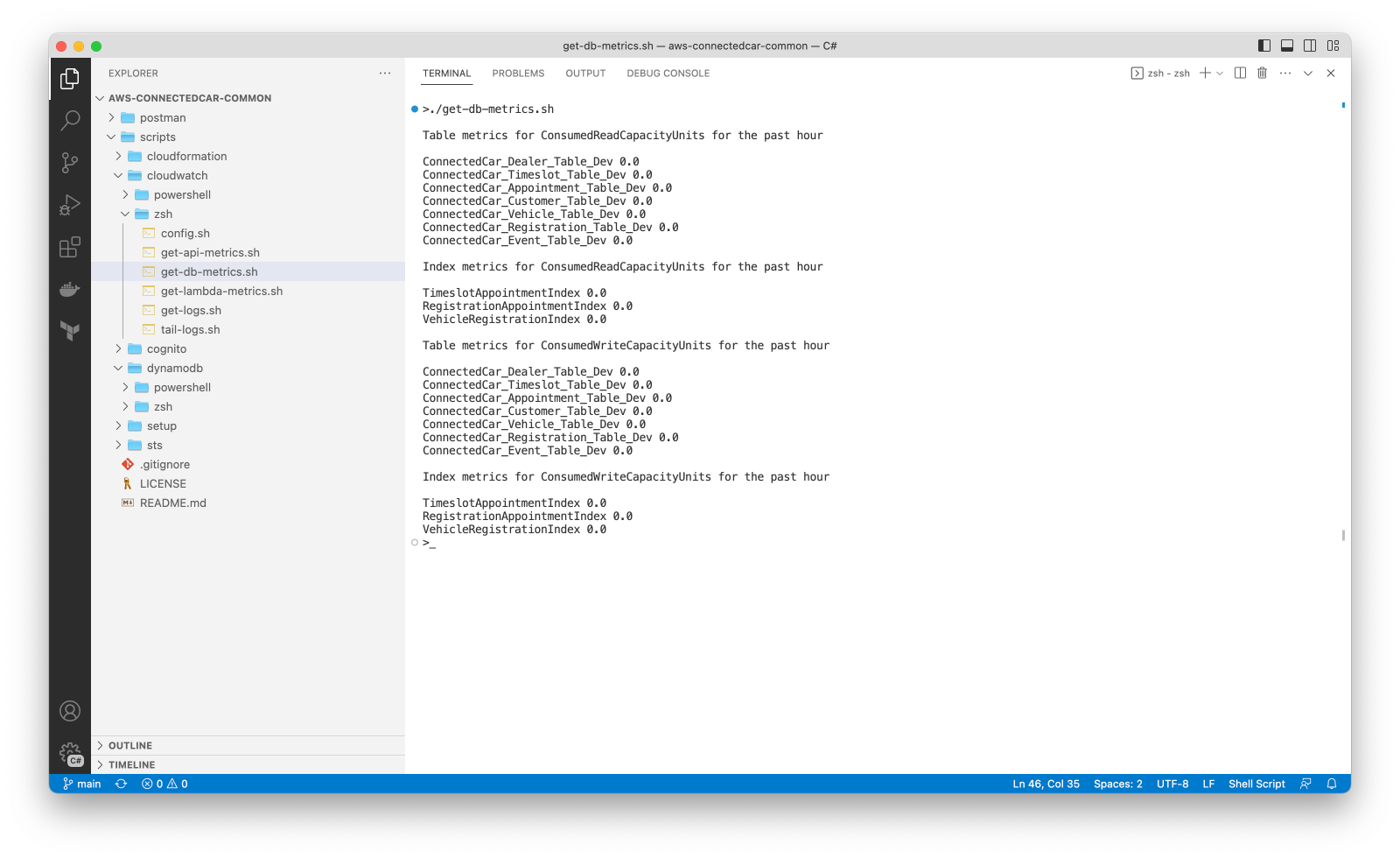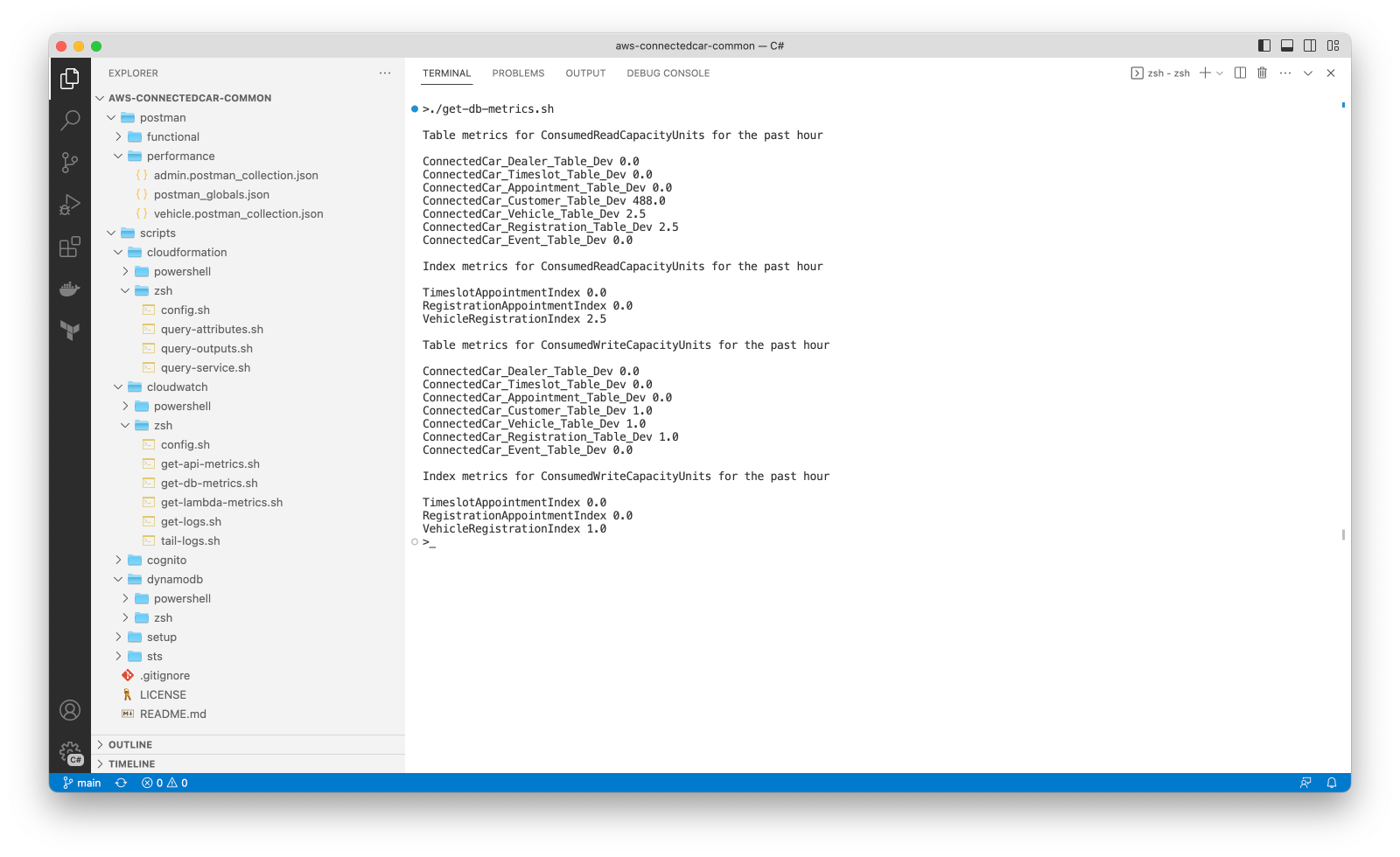 Before running the tests to simulate the scenario, you should make sure that there are no consumed capacity units for your DynamoDB tables and indexes for the past hour. To do this, open the “aws-connectedcar-common” repository in VS Code, open the terminal and change to the “/scripts/cloudwatch/zsh” folder. Then run the “get-db-metrics.zsh” script, which should show zeros for all the tables and indexes, for both read and write capacity units, as shown below: