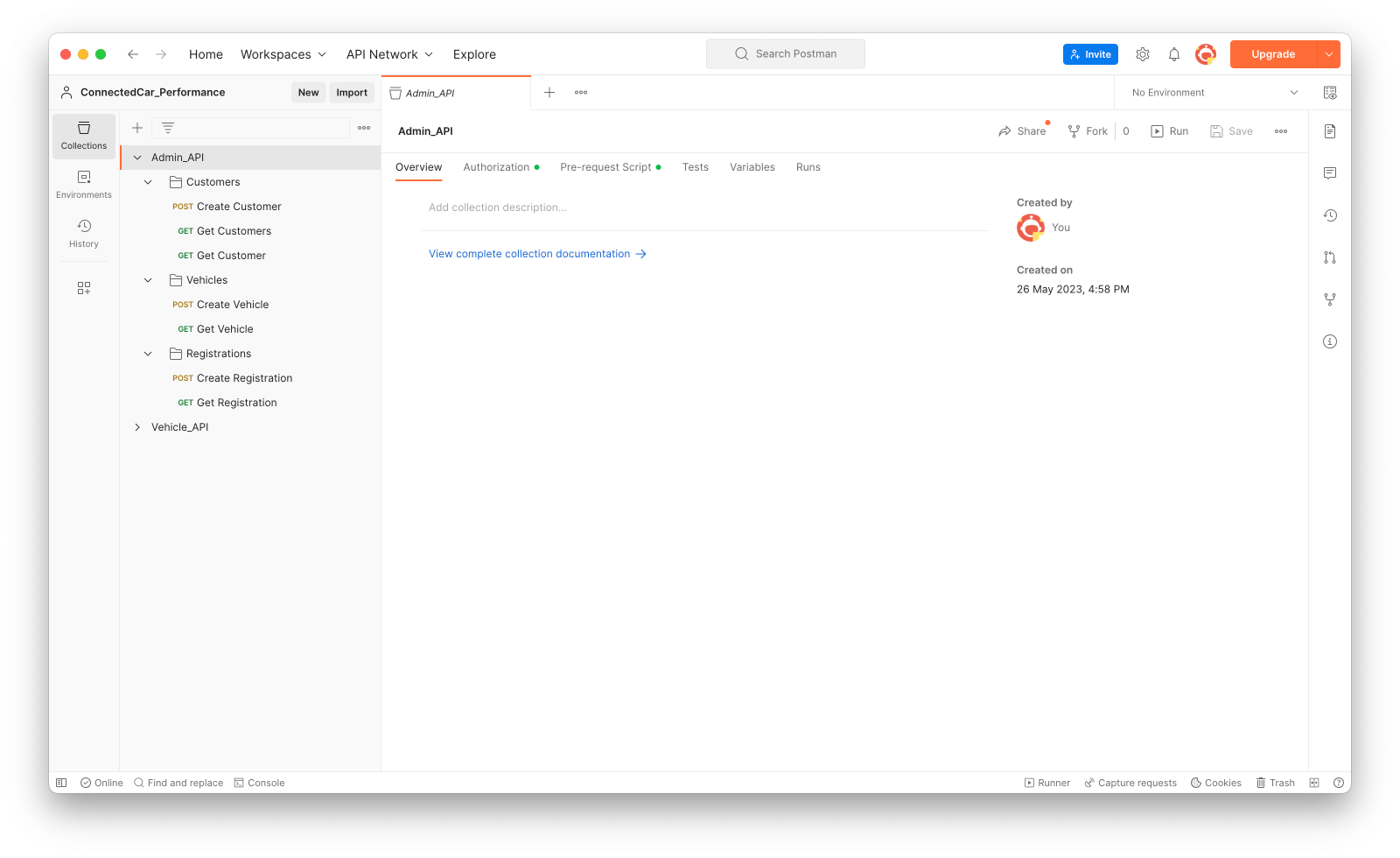 Start by switching to your other “ConnectedCar” workspace in Postman that has the performance-oriented test collections. Then import the “admin.postman_collection.json” file from the “/postman/performance” folder in the common repository. Once imported, you should see the folders and tests that are a subset of those found in the equivalent functional “Admin_API” test collection, as shown below: