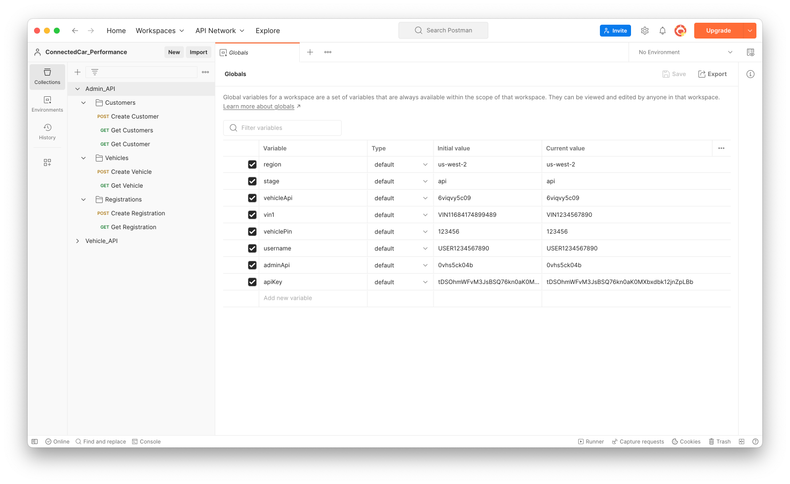 Like you’ve done before for the functional tests, you’ll need to get the API ID and the API key for the Admin API, either from the console, or by running the “get-outputs.zsh” and “get-attributes.zsh” scripts. You’ll then need to set these variables in the global variables editor tab, entering values for both the initial and current values, as shown below: