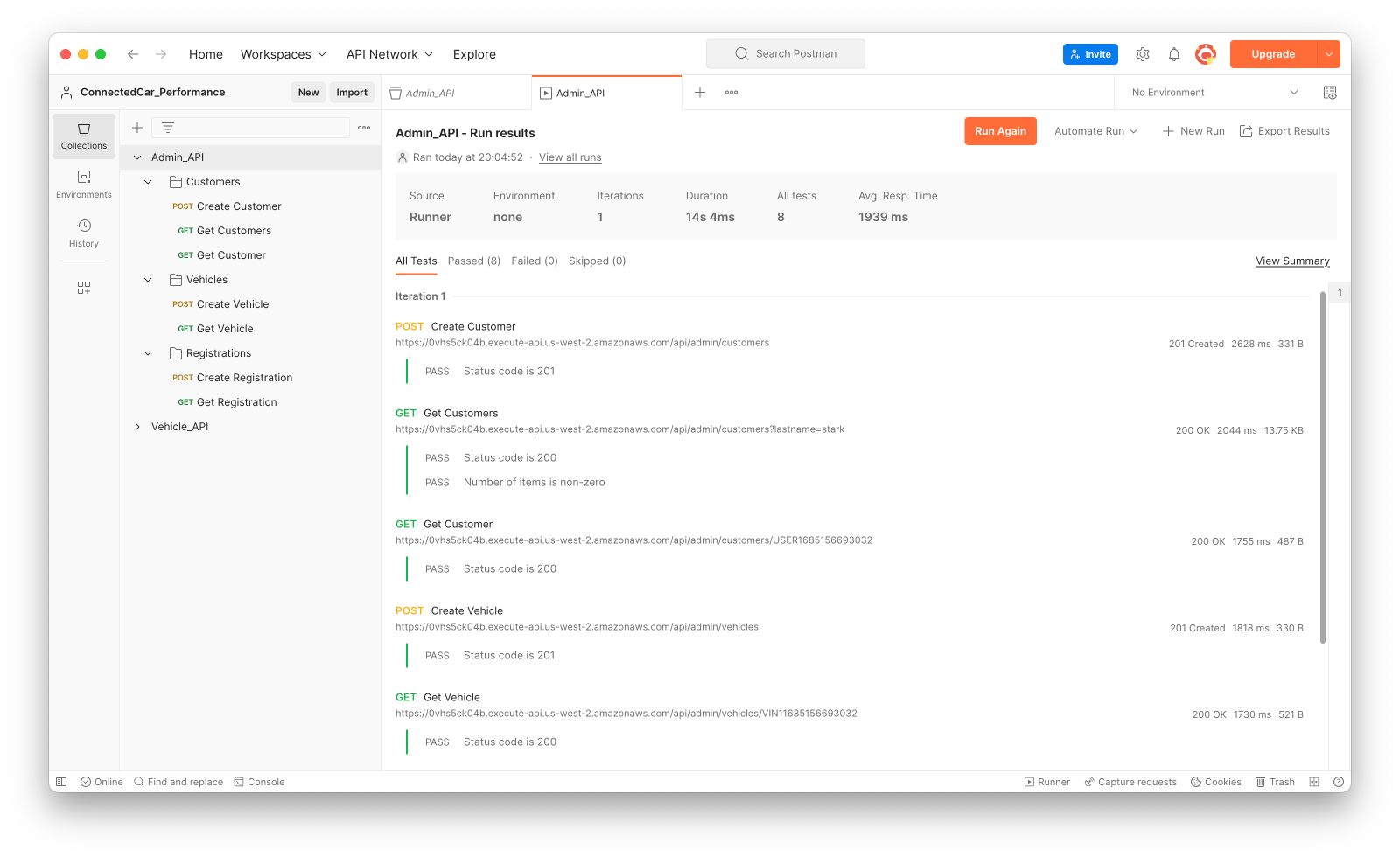 You should now be ready to run the tests for the simulation. Click on the “Admin_API” collection, and click the “Run” button. On the Runner tab that’s then displayed, click the orange “Run Admin_API” button, on the lower right. The completed tests should look like this in Postman: