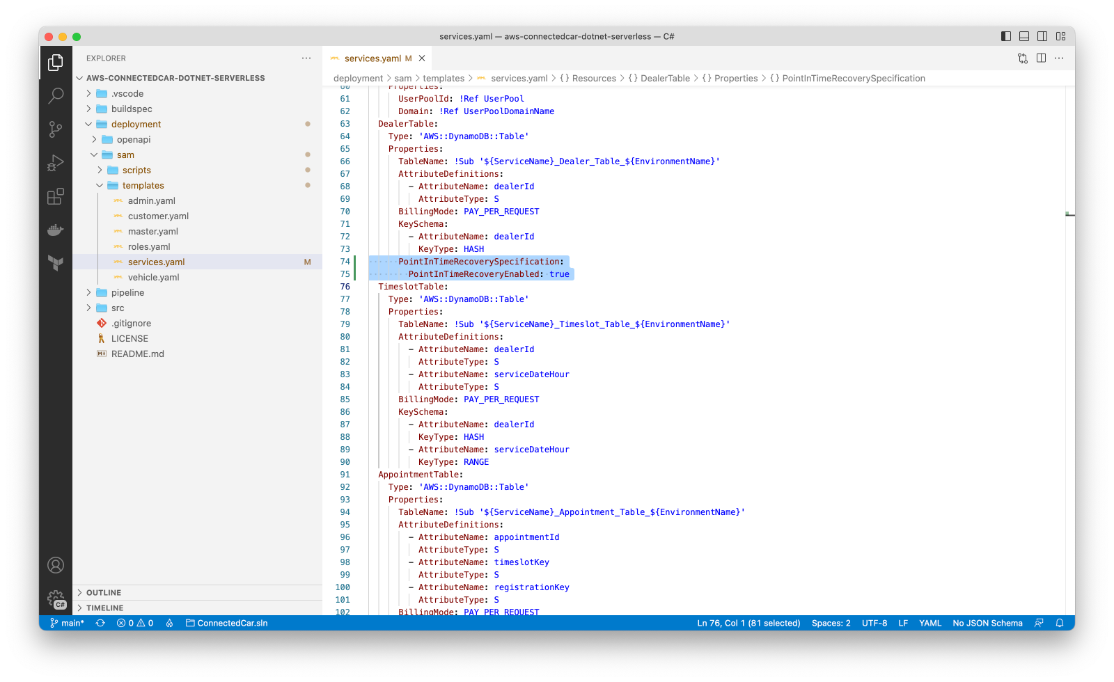 You’re now ready to restore the table to a point-in-time before you deleted the item, from ten minutes ago. Open the “aws-connectedcar-common” repository in VS Code and open the restore-table.zsh script that’s in the “/scripts/dynamodb/zsh” folder: