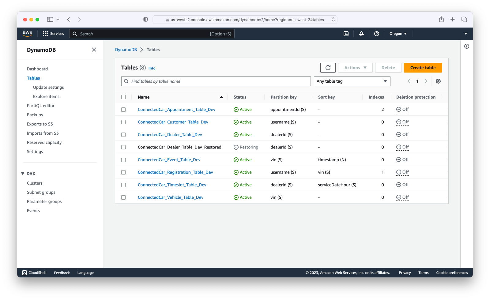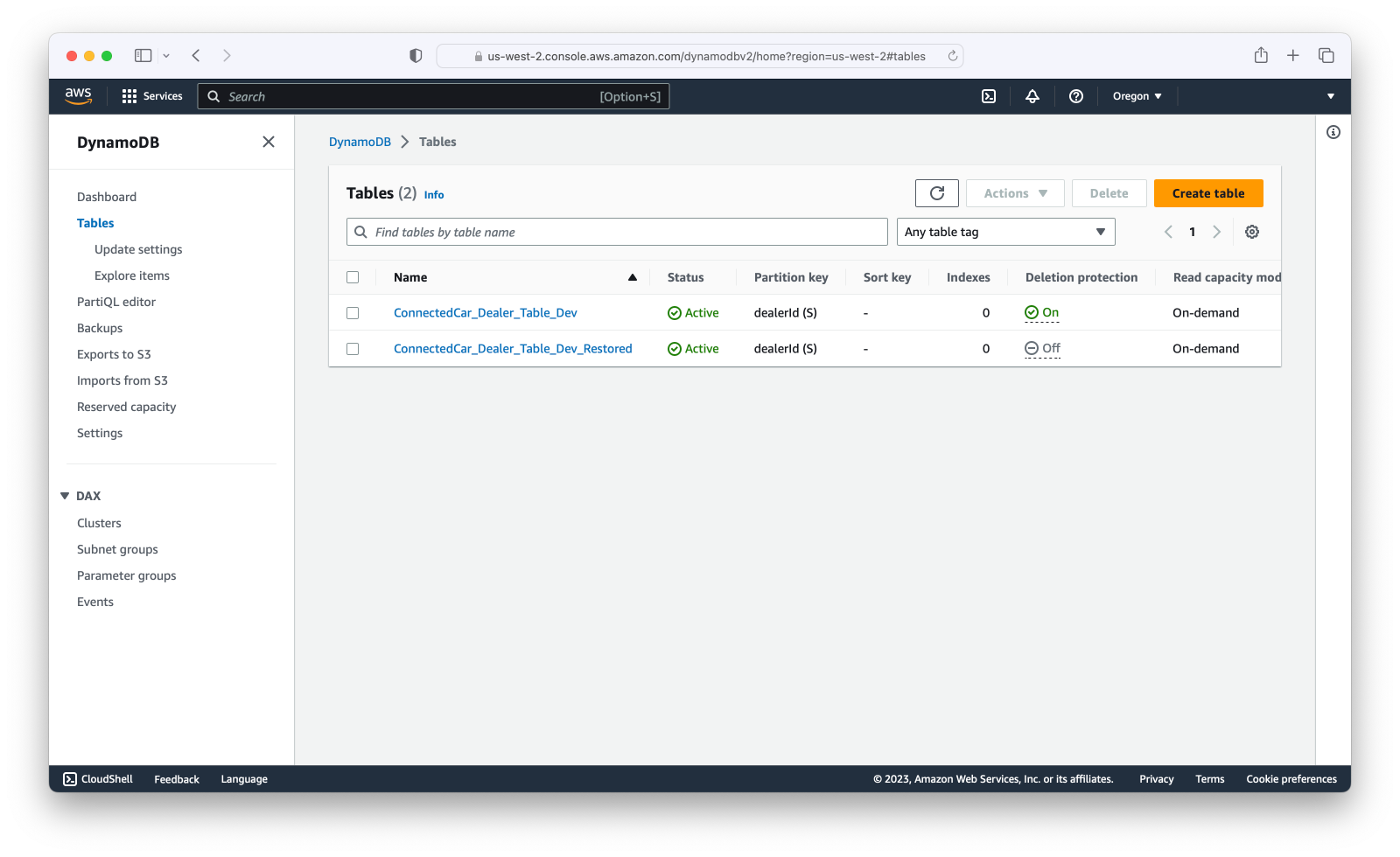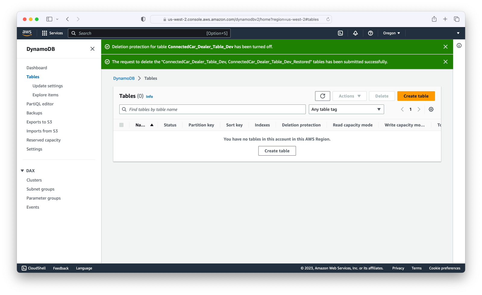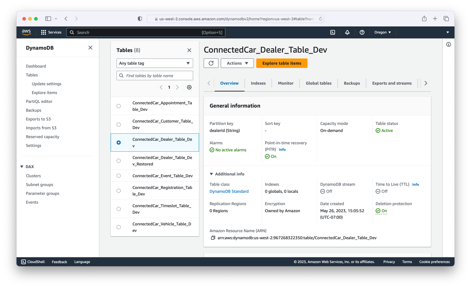 Lastly, go to the Tables page for the DynamoDB service and verify that the dealer table still exists:
