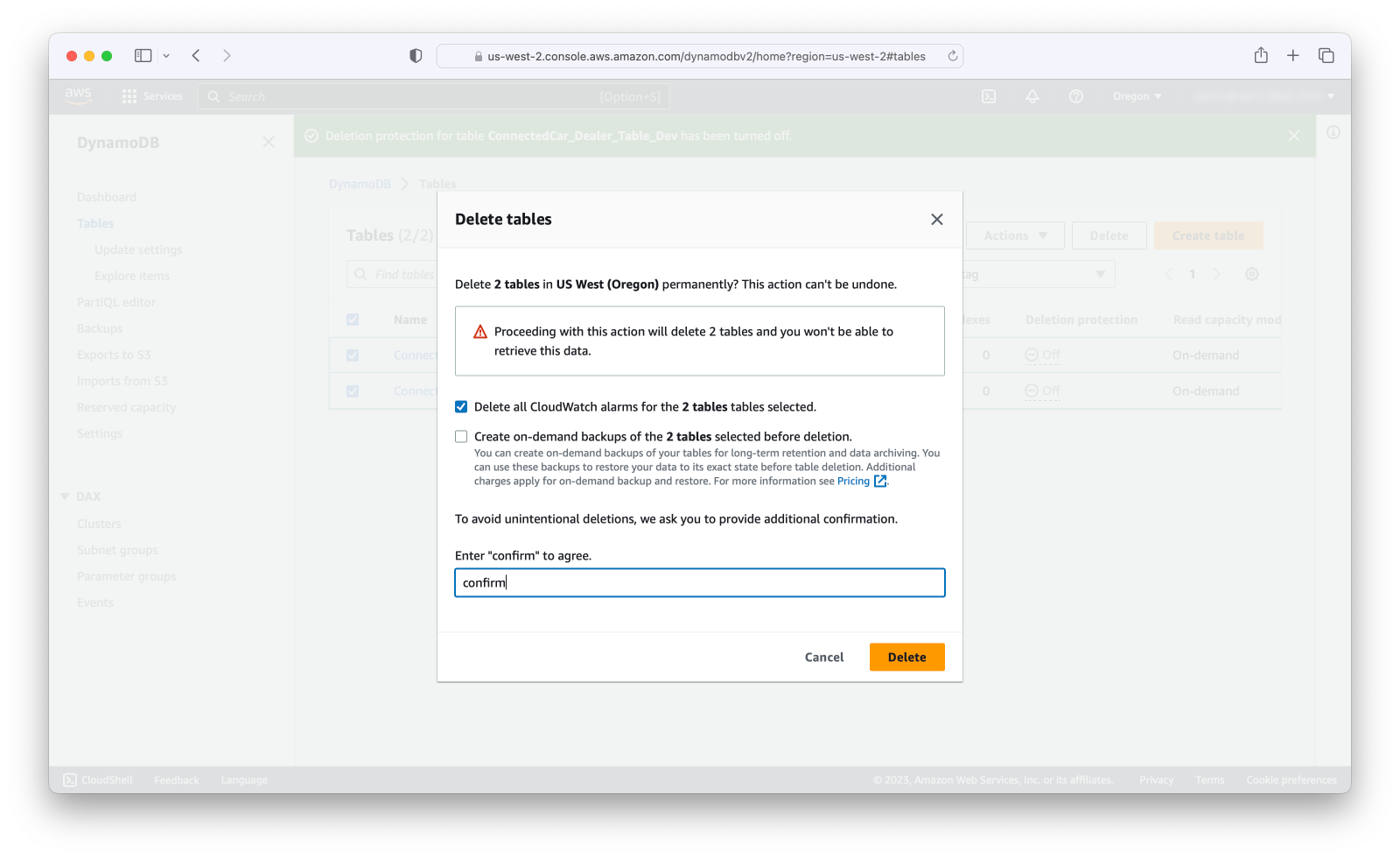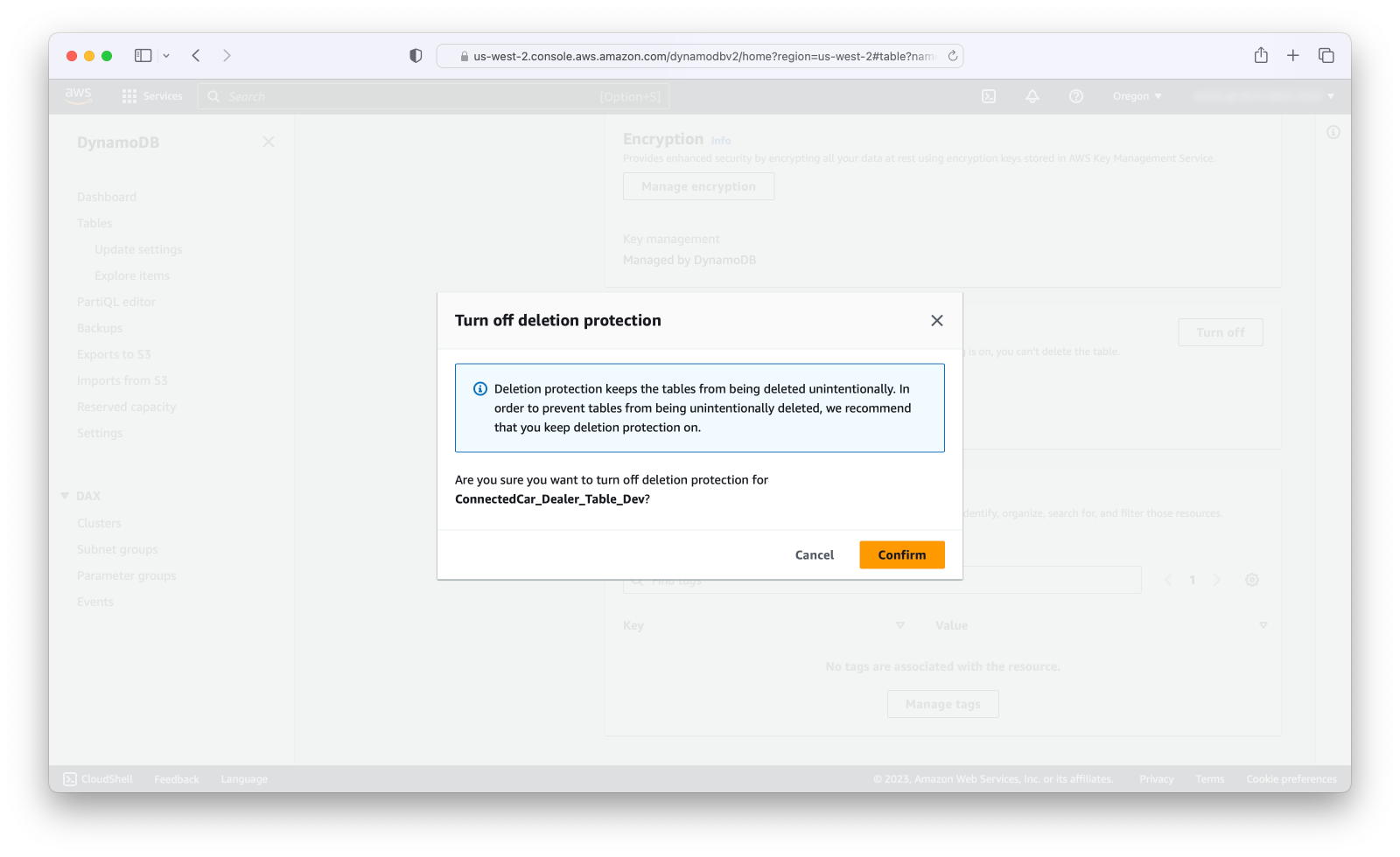 Navigate to the DynamoDB service in the console and select the “Tables” menu option. Select the “ConnectedCar_Dealer_Table_Dev” table and click on the “Additional settings” tab on the far right. Scroll down to the “Deletion protection” panel, where you should see a “Turn off” button. When you click this button, not surprisingly you get a warning dialog, as shown below: