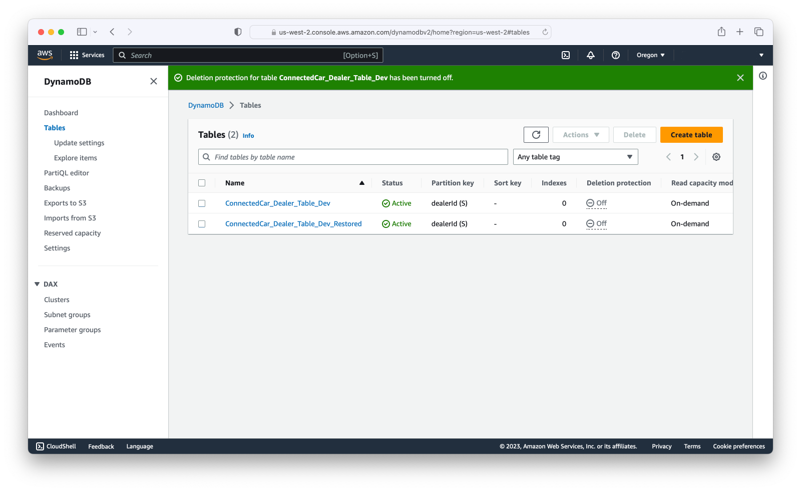 Navigate back to the main “Tables” page, where you should see the two remaining tables listed, both without delete protection, as shown below: