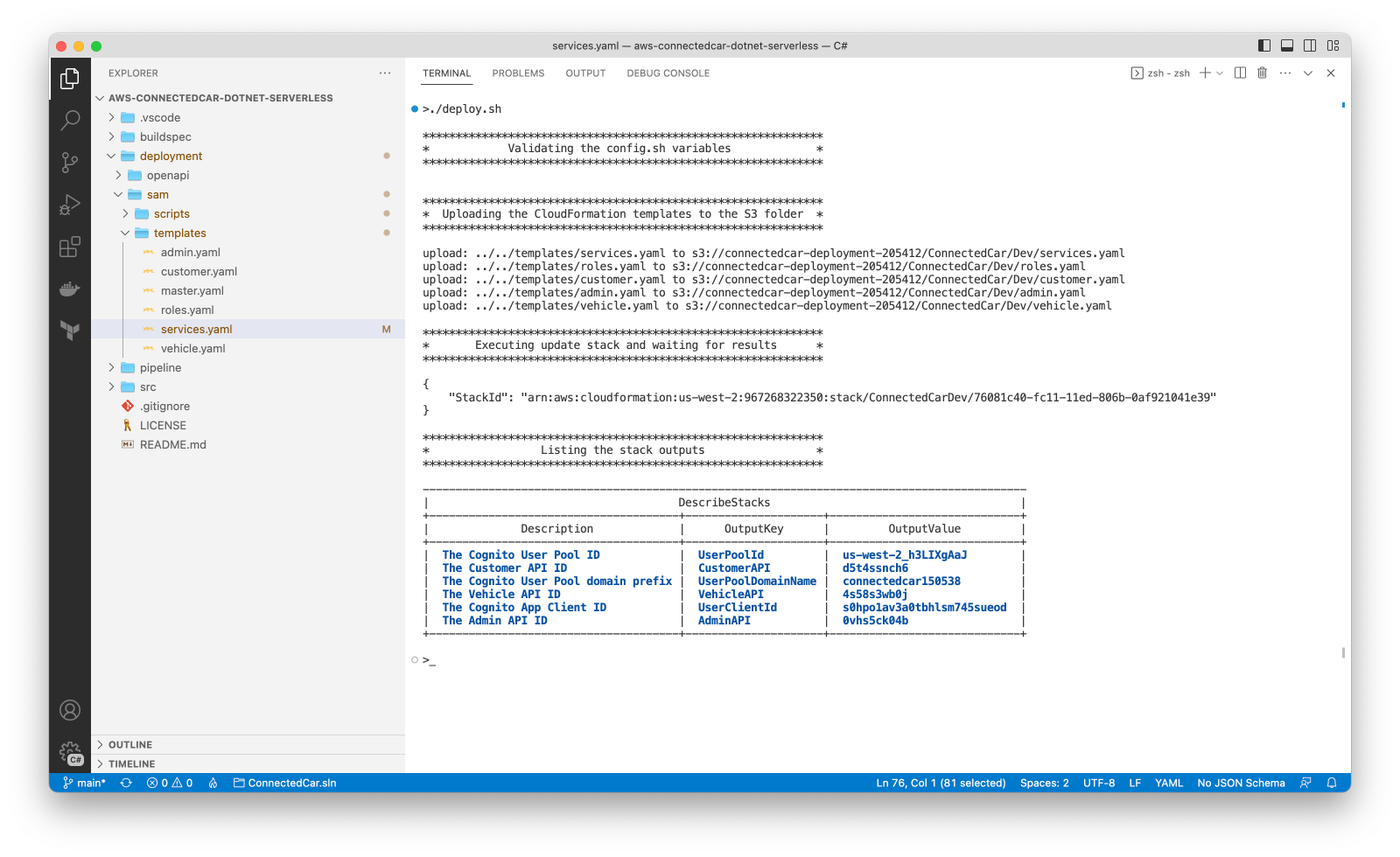 Next, run the deploy.zsh script to update the CloudFormation stack. As always, once the stack outputs are written in the VS Code terminal, the update is complete: