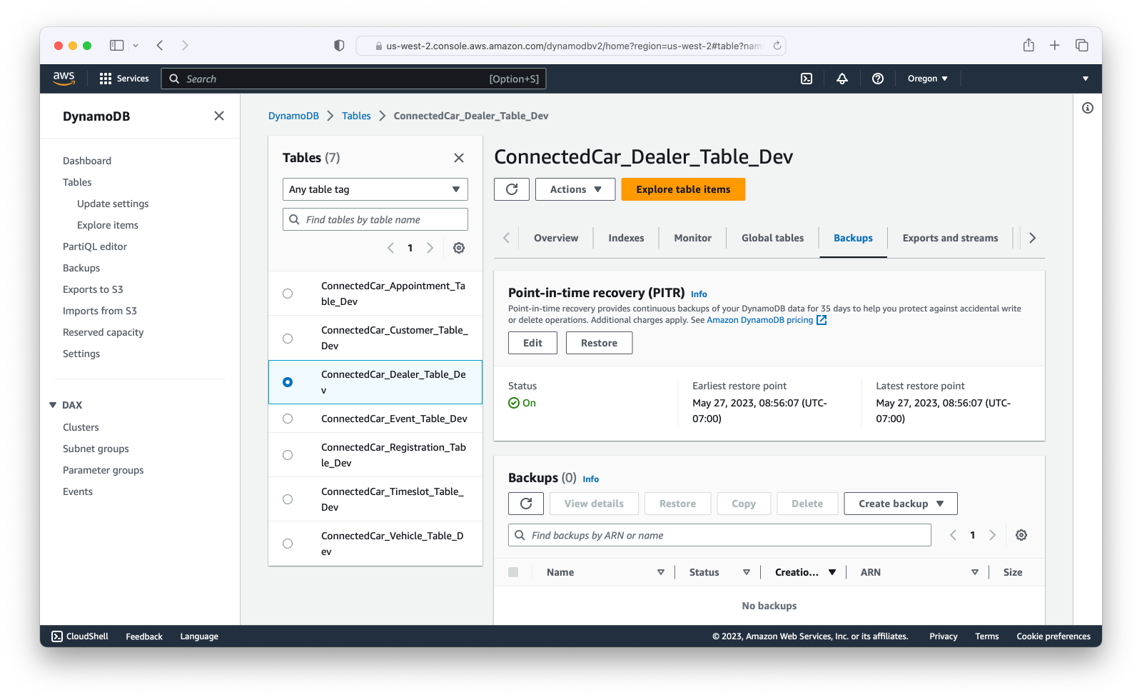 You can verify the update to the dealer table in the console. Navigate to the DynamoDB service, select the “Tables” menu option on the left, then the “ConnectedCar_Dealer_Table_Dev” table, and finally, select the “Backups” tab. You should see the “On” status on the “Point-in-time Recovery” panel, as shown below, along with timestamps for the earliest and latest restore points: