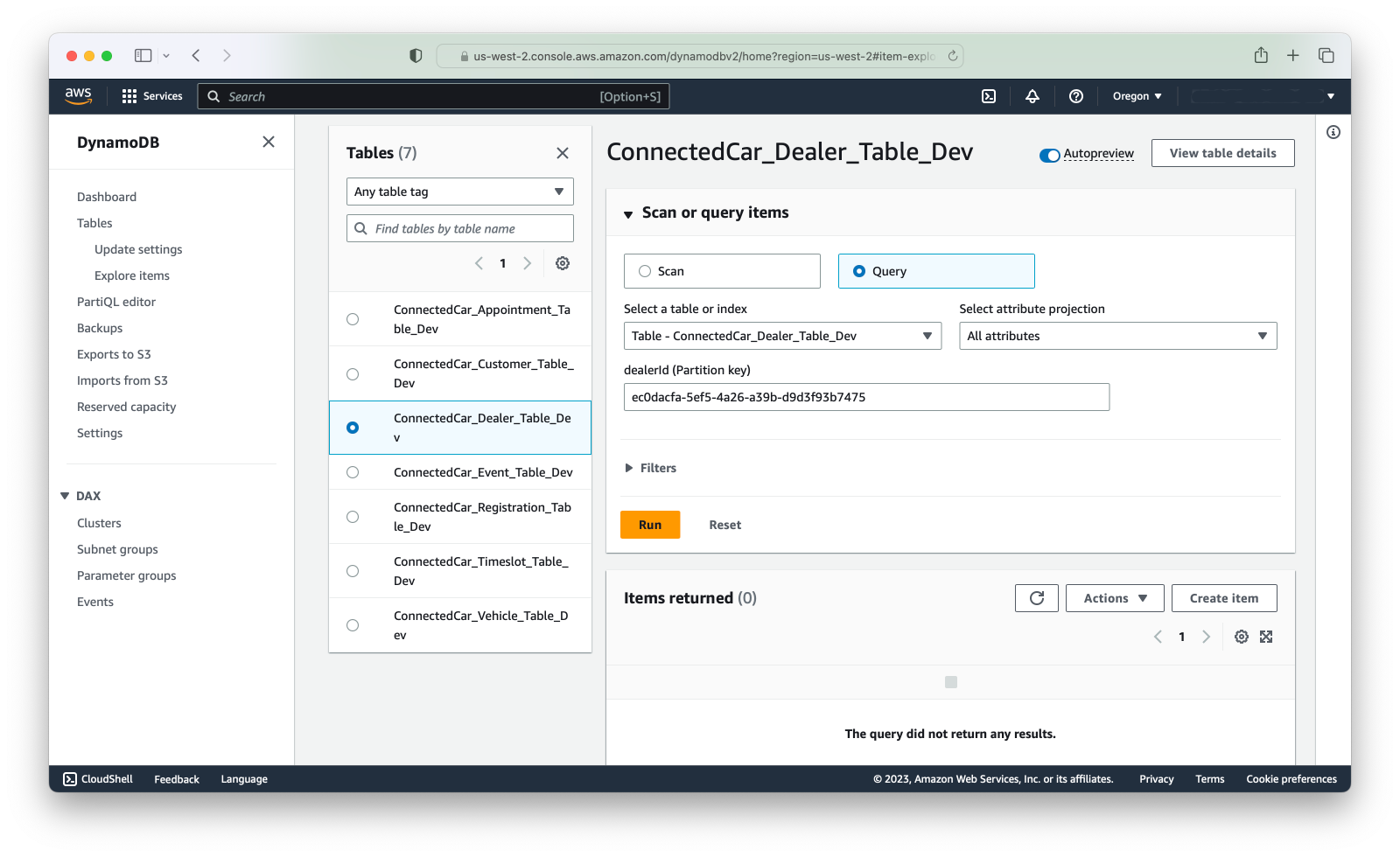 Navigate to the Explore items page in the console, select the “ConnectedCar_Dealer_Table_Dev” table, and pick a random item in the list. Copy and paste the dealerId for this item to a text editor, and then select the item and delete it. You can use the query panel at the top of the page, as we did in the earlier lab, and query for this item by the dealerId. As shown below, it should not be found:
