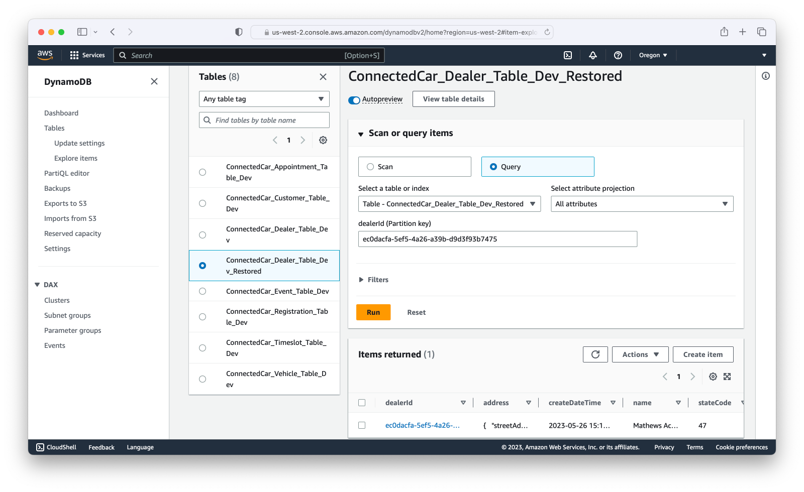 Lastly, while still in the console, select the restored table on the “Explore items” page, open the query panel and paste in the dealerId for the item previously deleted. When you run the query you should get a result for this item, demonstrating that the deleted data has been restored:
