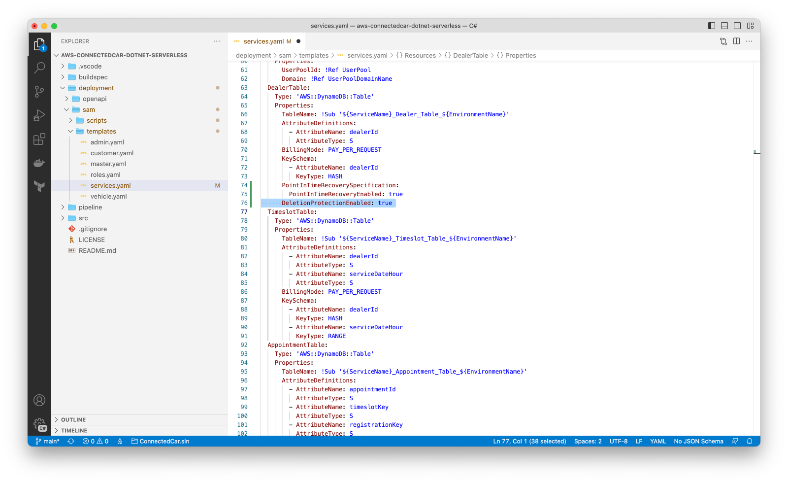 Add these two lines of code to the DealerTable resource in the services.yaml template, as shown below: