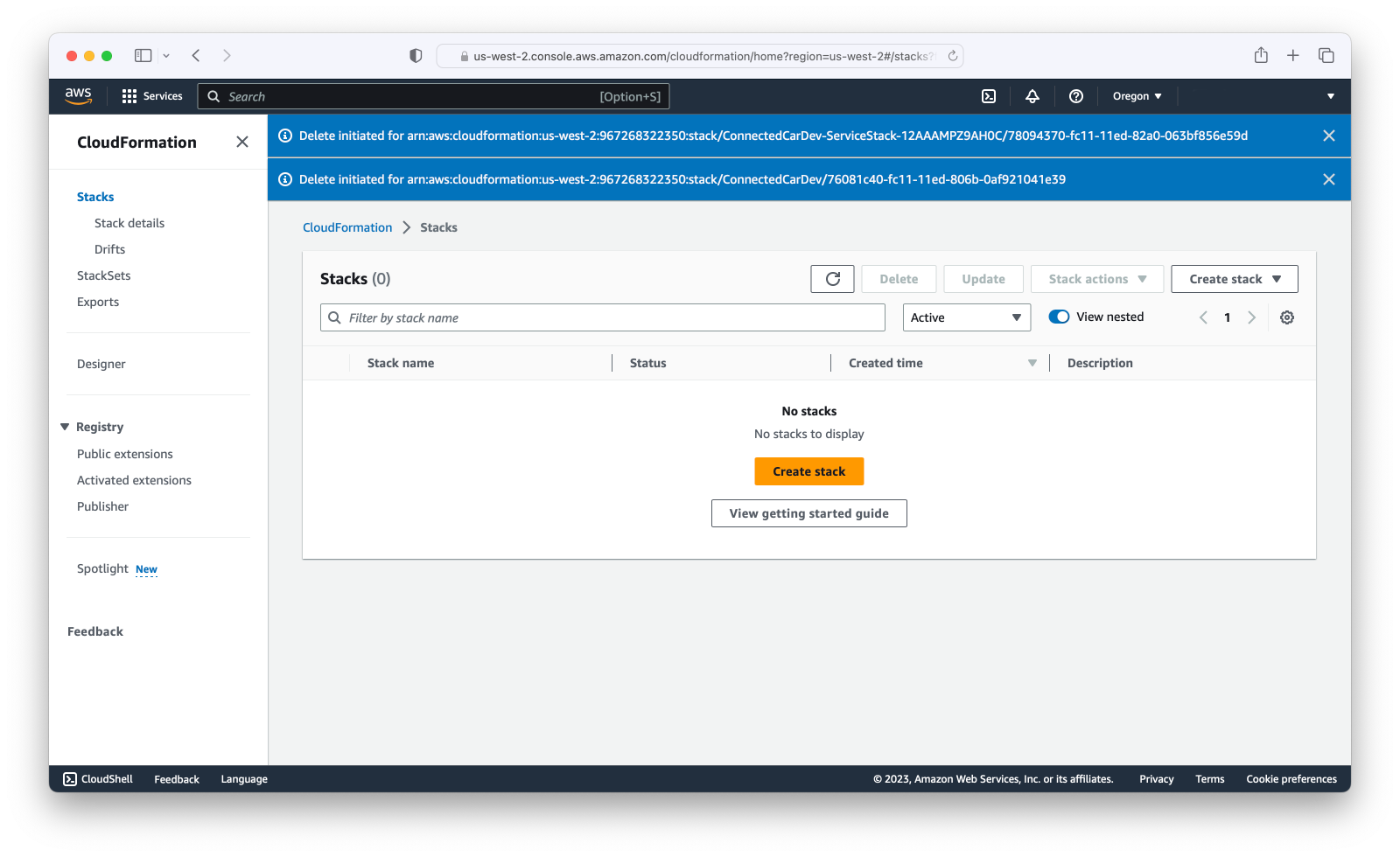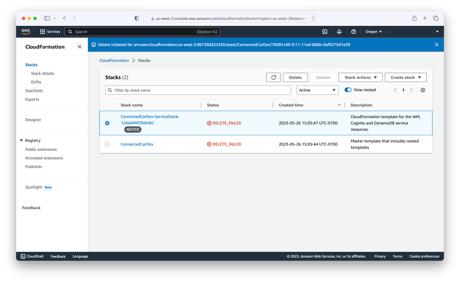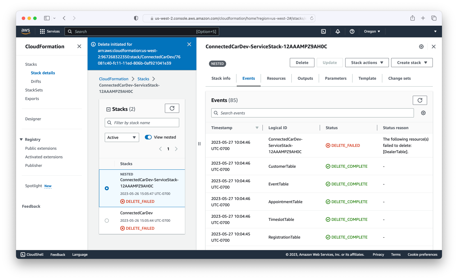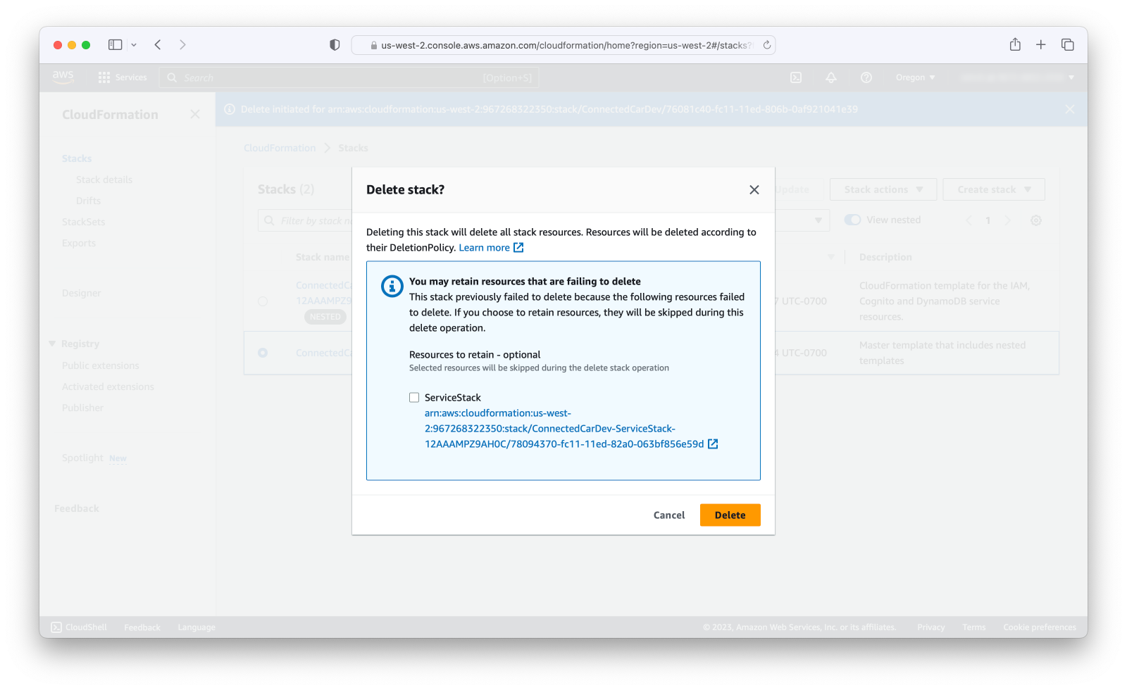 Next, delete the deployed stack in CloudFormation in the console, as done previously, by selecting the parent stack and clicking the “Delete” button. The deletion will proceed normally until it gets to the service stack, at which point it should fail, as shown below: