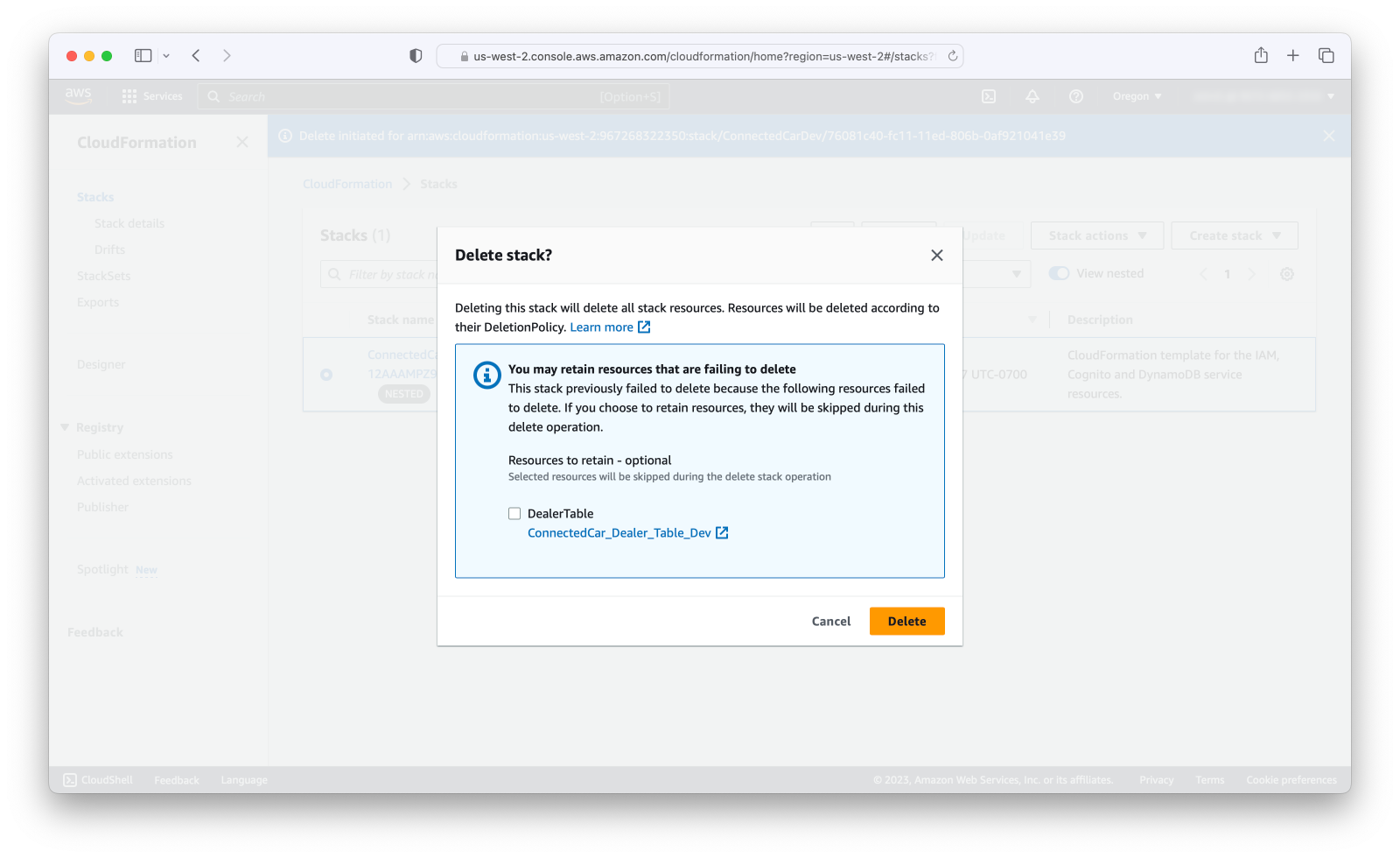 CloudFormation is now giving you the opportunity to delete the stack, but also retain resources that are failing to delete, which in this case is the child ServiceStack. Select the checkbox and click the orange “Delete” button to proceed. The parent stack will now be deleted, but the service stack will remain. Now you can attempt to delete this stack, at which point you will again see this dialog box, but this time offering to retain the DealerTable resource: