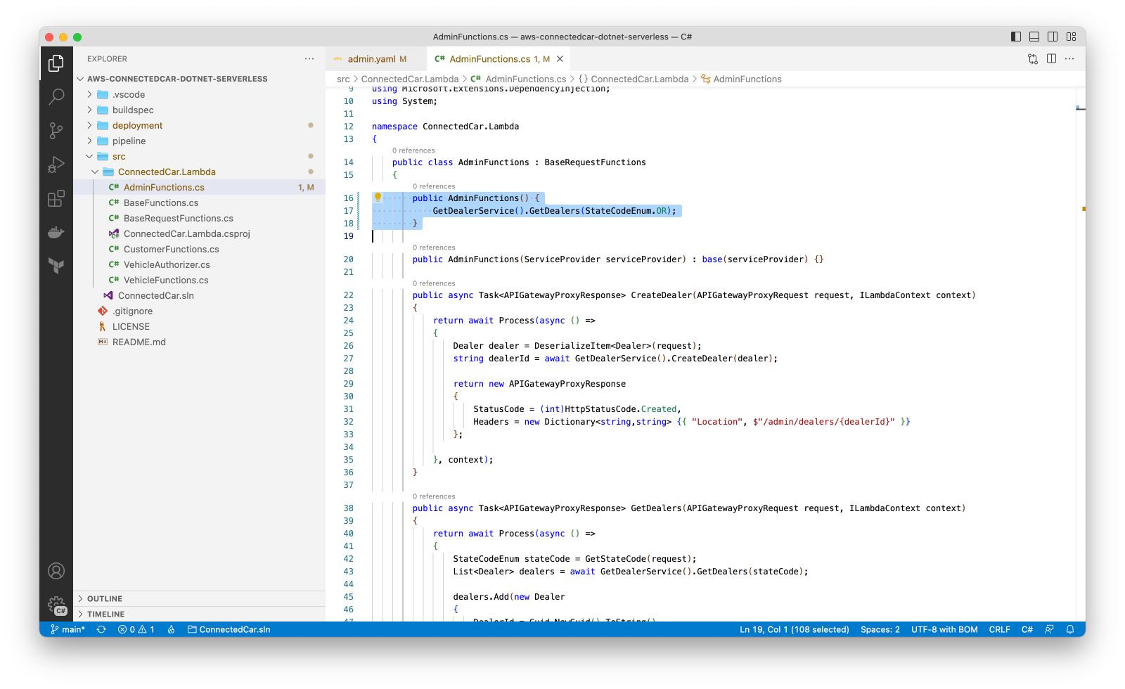 This lab references the code in the aws-connectedcar-dotnet-serverless repository. If you're new to this course, see the introduction for information about setting up your workstation and getting the sample code.