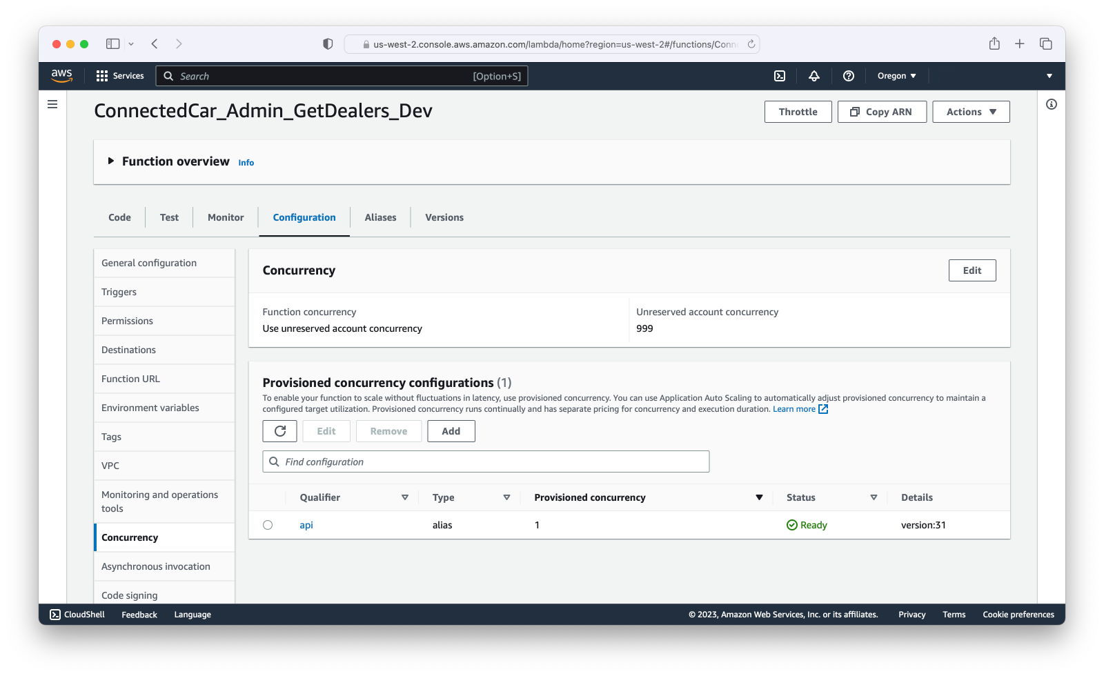 With these code and configuration updates in place, run the deploy.zsh script again. Once deployed, you should see the updated value under “Provisioned concurrency” column, associated with the alias, in the console as shown below: