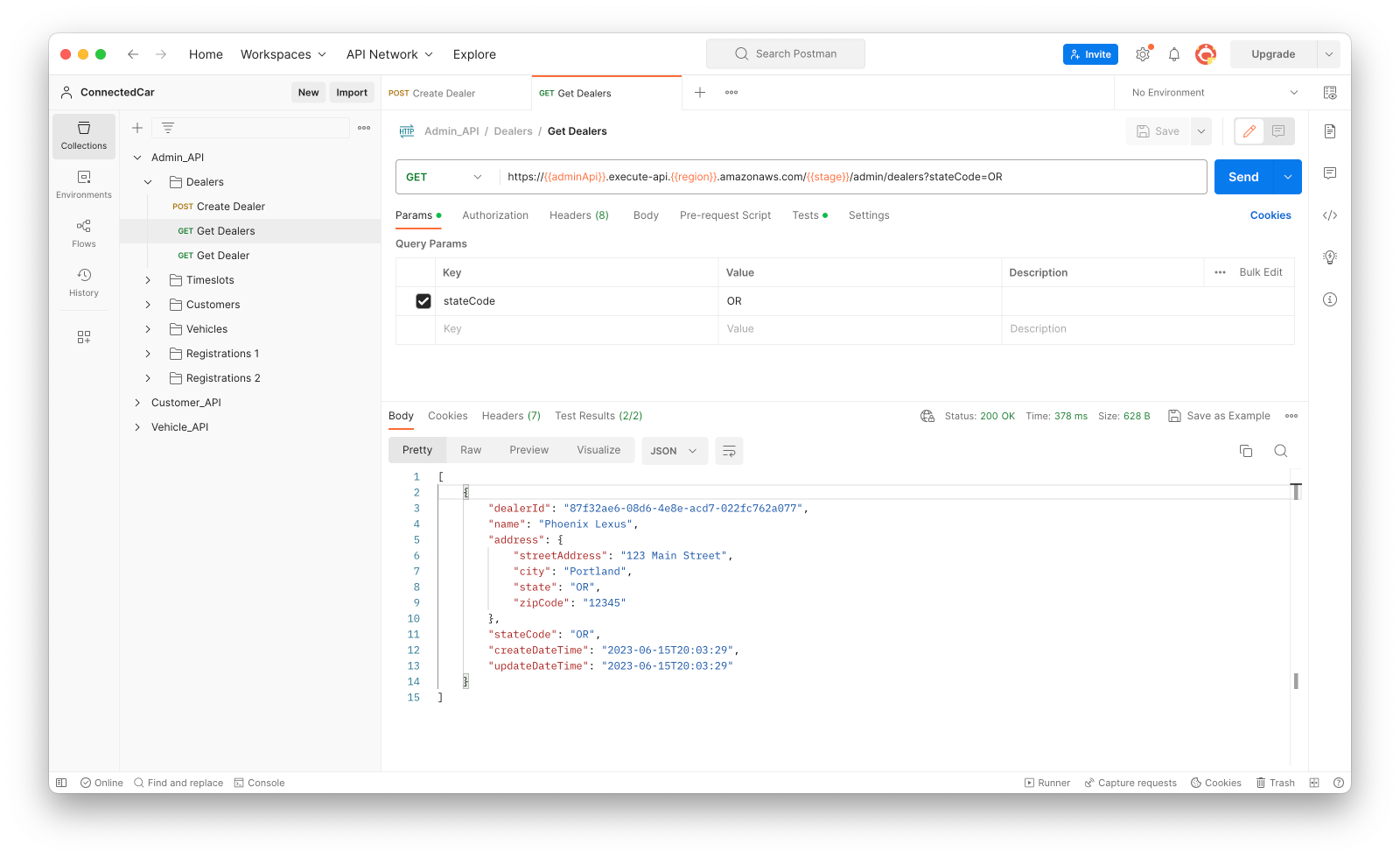 Step 4: Send two requests for the Get Dealers Lambda in Postman