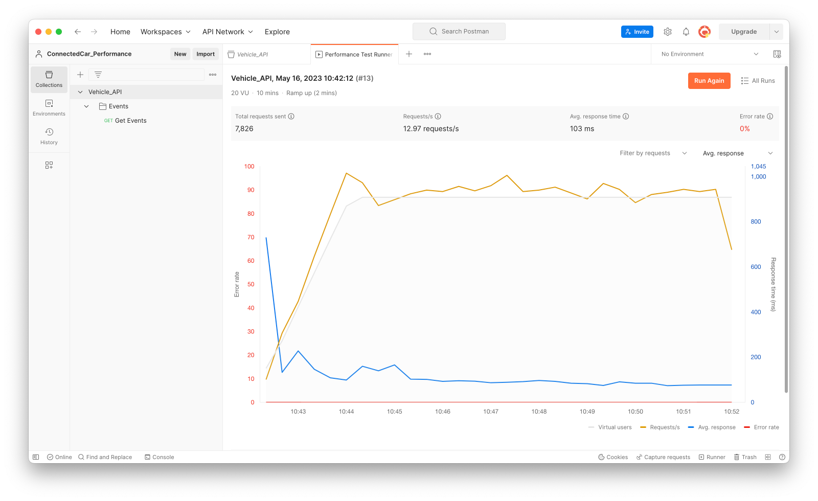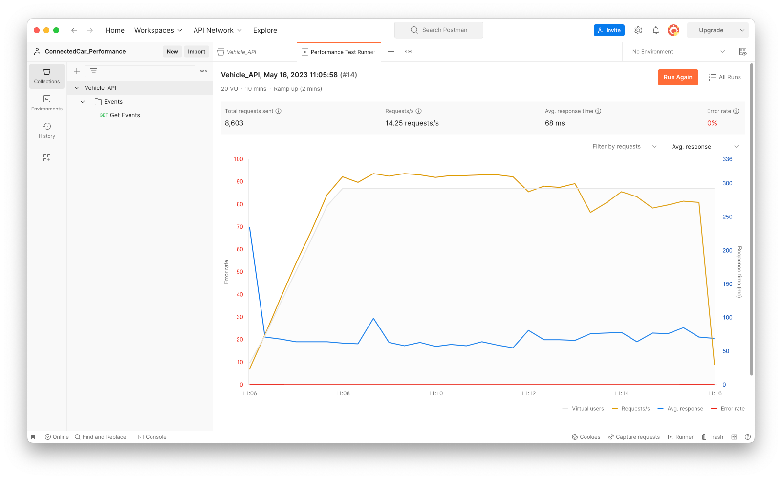 You’re now ready to use Postman Canary to run a small load test against the GetEvents Lambda. In the new performance workspace, select the “Vehicle_API” collection at the left, then click on the “Run” button at the top-right of the screen. Then, on the “Runner” tab, click the “Performance” sub-tab on the panel at the right of the screen. You should now see the load testing options. You can keep the default number of virtual users and the test duration. Just add a two minute ramp up, as shown below: